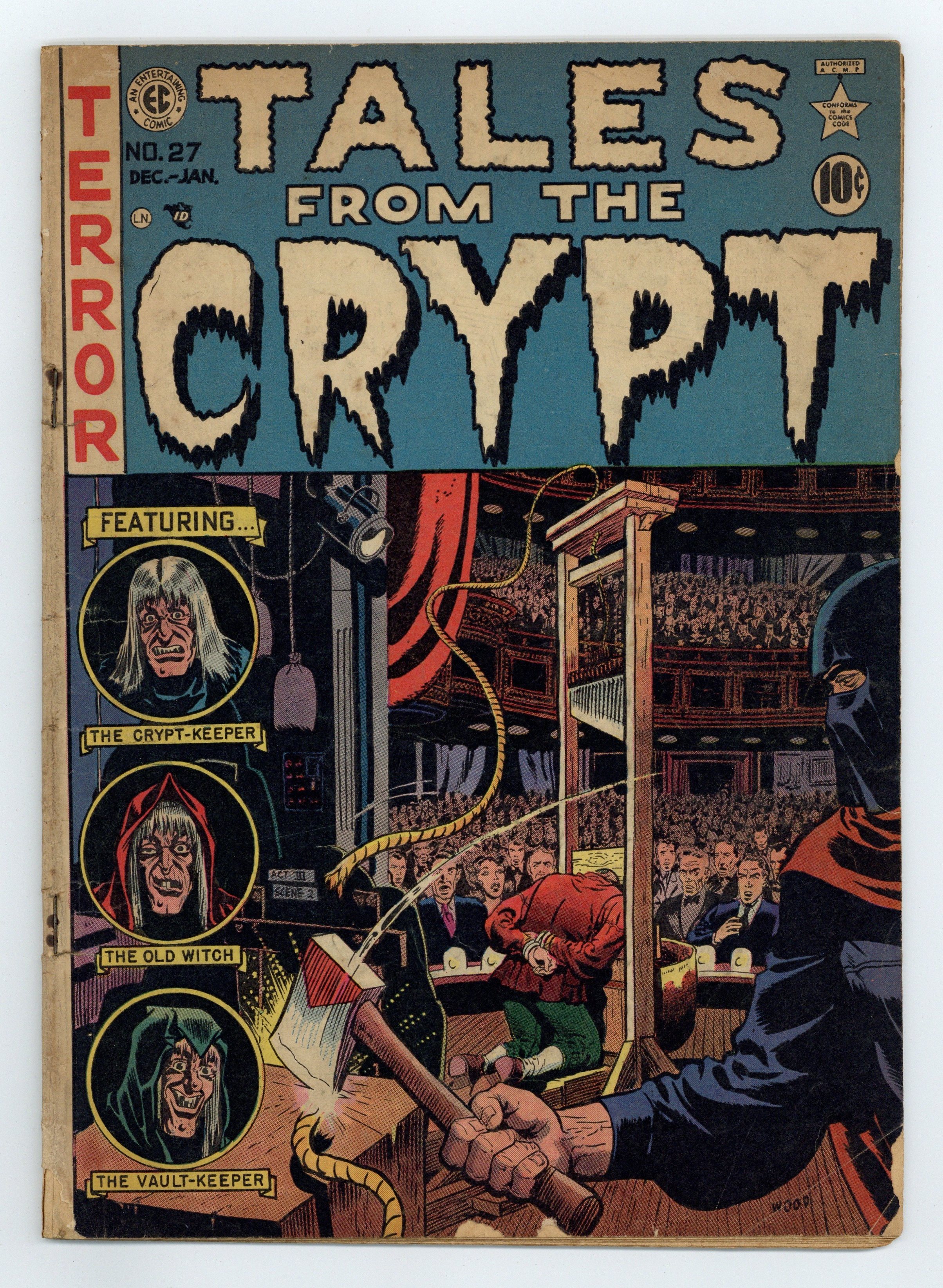 Cover by Wally Wood. "Well-Cooked Hams!", script by Al Feldstein, art by Jack Davis; Two American producers want to bring Parisian-style, Grand Guignol, gory plays to a Broadway theater, but the owner refuses to do business with them. "Madame Bluebeard," script by Al Feldstein, art by Joe Orlando; A woman raises her daughter to hate men and so for six years she murders a husband a year, making each appear an accidental death, as trophies for her departed mother. "Nature" text story. "Return!", script by Al Feldstein, art by Jack Kamen; A woman ends up getting pregnant by her husband's ghost! "Horror! Head... It Off!", script by Al Feldstein, art by Graham Ingels; A member of the French nobility during the Terror betrays his fellow's confidence in order to curry favor with the revolutionary government. 36 pgs., full color. $0.10. Cover price $0.10. Grade: GD+ 2.5 explanation of grade Condition: Used (collectible)