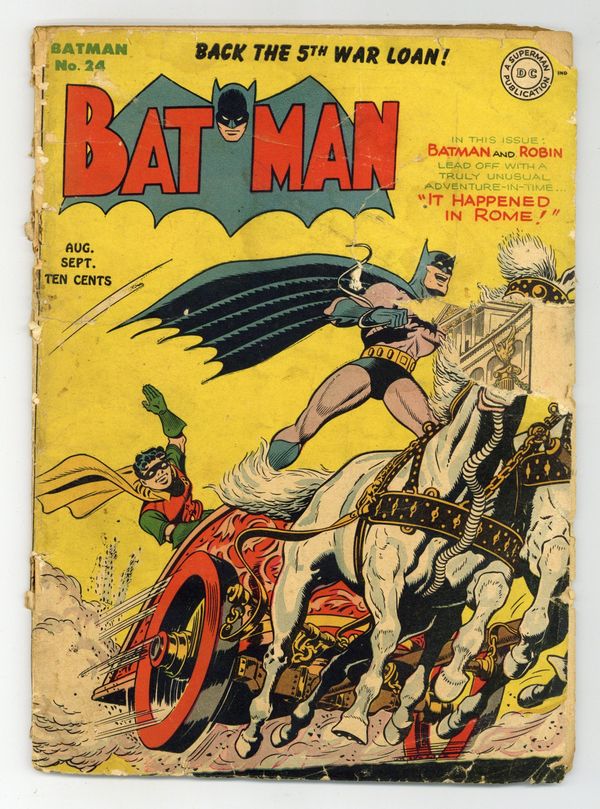 Cover by Dick Sprang. "It Happened In Rome," script by Joe Samachson, art by Dick Sprang (as Bob Kane); Bruce Wayne is sent back to the time of the ancient Romans and runs afoul of a high official as Batman, so Robin must also make the journey back to help the Caped Crusader get out of the jam he is in. "Convict Cargo!", script by Don Cameron, art by Dick Sprang (as Bob Kane); Bruce Wayne allows himself to come under investigation by the District Attorney for juggling the books in order to ferret out a clever gang that, for a price, makes wealthy suspicious men like Wayne "disappear" from prosecution. 1-page Gee-Man story by Ray McGill. "Western Incident" text story by Tex Palmer. "Police Line-Up!", art by Jerry Robinson (as Bob Kane); Alfred attends a Police line-up in order to sharpen his visual recognition skills, something that nearly backfires on him. "The Mayors of Yonville!", script by Don Cameron, art by Dick Sprang (as Bob Kane); The Caped Crusaders must save the people of Yonville from a gold swindle, but they have to break out of jail to accomplish it. 1-page Private Pete story by Henry Boltinoff. 52 Pages, Full Color. Cover price $0.10. Grade: FR 1.0 explanation of grade Condition: Used (collectible)