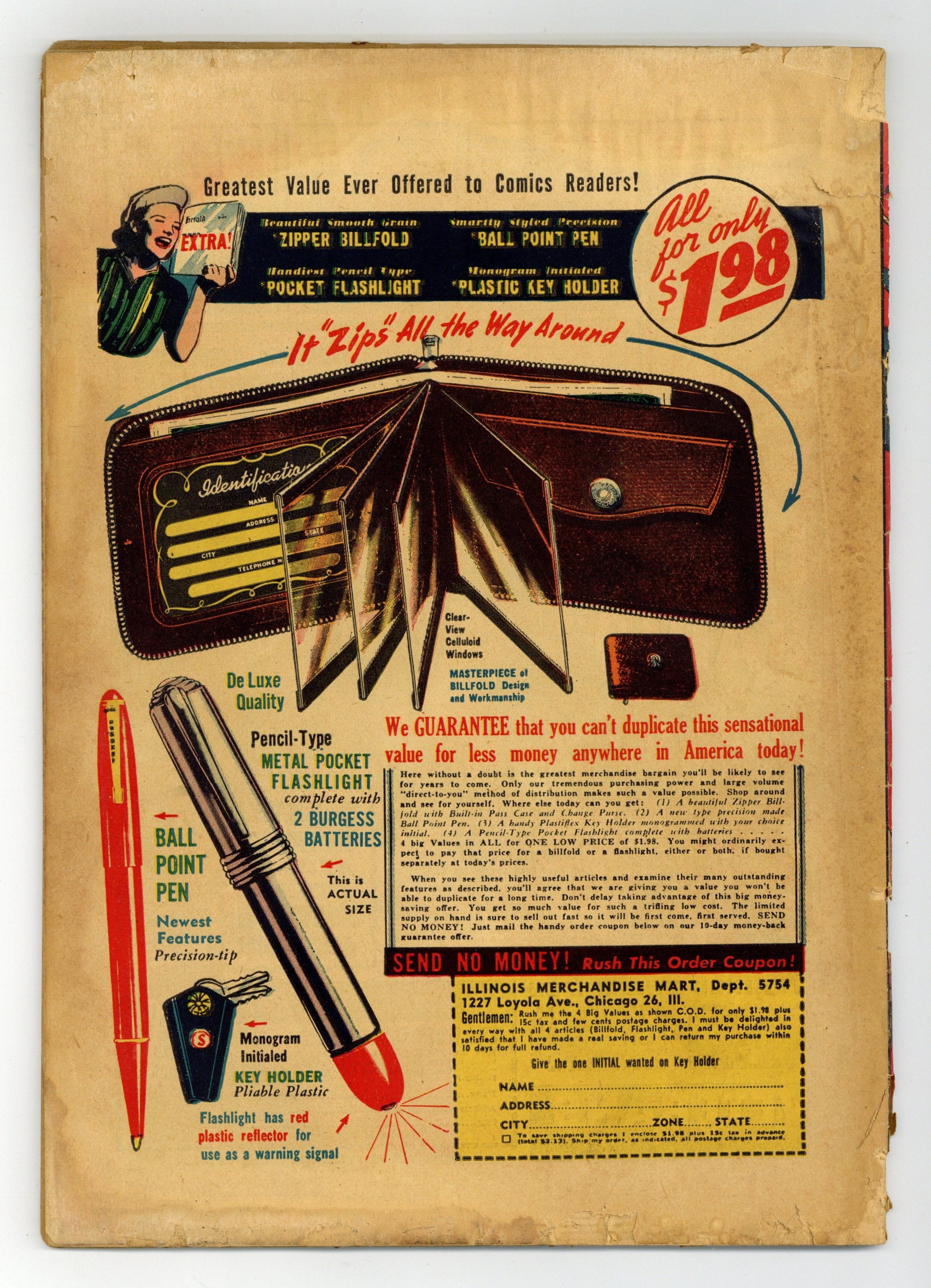 Cover by Win Mortimer. The Man With the Automatic Brain!:, script by Bill Finger, pencils by Bob Kane (Batman and Robin figures only) and Lew Sayre Schwartz, inks by Charles Paris; The Thinker, using a machine he created, pretends to discover Batmans secret identity; To prevent The Thinker from achieving his goal, Bruce stages his death with Alfred's help; Vicki Vale takes a picture of Alfred tossing a dummy of Bruce into the ocean; Alfred is taken to prison for the murder of Wayne. Batman and the Vikings!, pencils by Bob Kane, inks by Charles Paris; When Bruce and Dick visit the Gotham City museum, they note an image of a Viking that looks like Bruce Wayne.....and who is labeled a coward, so they visit Carter Nichols to go back in time to discover the truth. Untitled two-page Peg story by Henry Boltinoff. Fearless Wise Man text story, art by Raymond Perry. Cartoon Flips Starring Batman activity page by Martin Naydel. The Happy Victims!, script by Bill Finger, pencils by Bob Kane (Batman and Robin figures only) and Lew Sayre Schwartz, inks by Charles Paris; The Joker blackmails people into setting up fake robberies; The robberies stop when he tries to blackmail Bruce Wayne. 52 Pages, Full Color. Cover price $0.10. Grade: FR 1.0 explanation of grade Condition: Used (collectible)