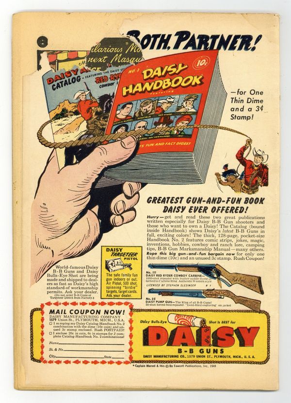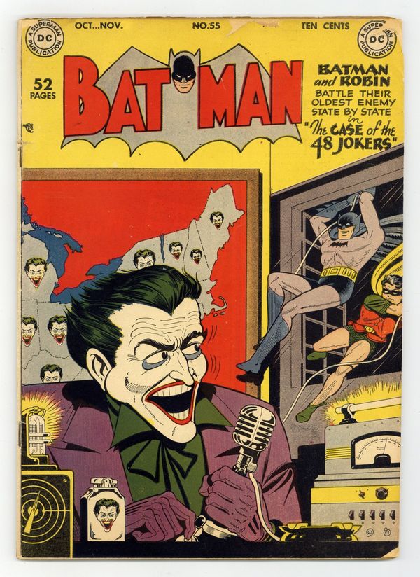 Cover pencils by Dick Sprang, inks by Charles Paris. The Case of the 48 Jokers!, script by Bill Finger, pencils by Dick Sprang, inks by Stan Kaye; The Joker starts his own criminal school; He prepares thugs from 48 States to become part of a large network of criminals; Batman and Robin learn of the cross-country crimes and confront the Joker in his base of operations. Bruce Wayne, Rookie Policeman!, pencils by Bob Kane, inks by Charles Paris; Bruce Wayne agrees to carry on the honorable work of a dying policeman; He becomes a member of the Gotham City Police Department, but his duties create conflict with his work as Batman. One-page Fluffy story by Phil Berube. Stay in School -- Give Yourself a Chance public service announcement starring Buzzy, script by Jack Schiff, art by Bob Oksner. It's Your Future text story, art by Raymond Perry. Half-page Casey the Cop story by Henry Boltinoff. The Bandit of the Bells!, pencils by Bob Kane and Charles Paris, inks by Charles Paris; Batman and Robin must prevent the crimes of Gong, controls every kind of bell; When he steals a particularly valuable bell, Batman investigates. 52 Pages, Full Color. Cover price $0.10. Grade: FR 1.0 explanation of grade Condition: Used (collectible)