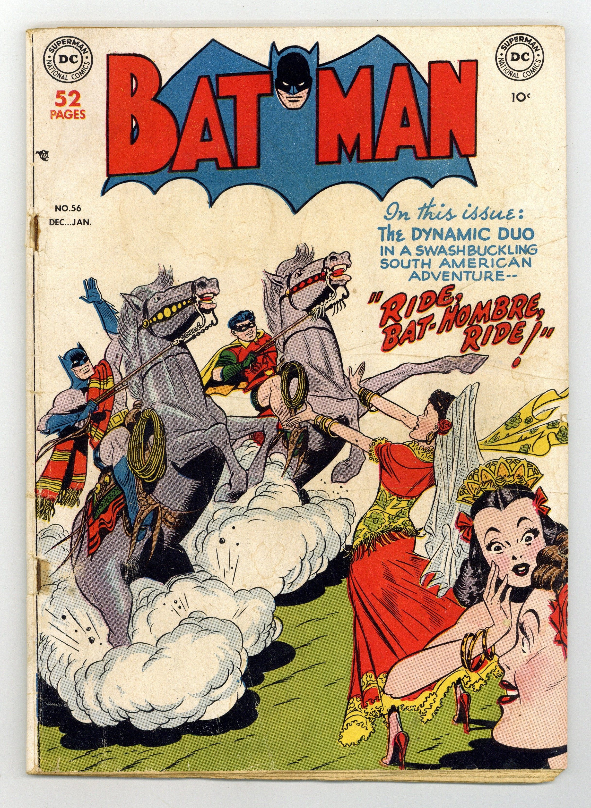 Cover pencils by Dick Sprang, inks by Charles Paris. Ride, Bat-Hombre, Ride!, script by David Vern Reed, pencils by Dick Sprang (as Bob Kane), inks by Charles Paris; The sickly Presidente of a Latin American nation implores the Caped Crusaders to come to his nation and train a Batman to keep law and order in his country. The Riddle of the Seven Birds!, script by Bill Finger, pencils by Dick Sprang, inks by Charles Paris; To receive money from gangster "Squeeze" Miller, the Penguin must complete seven robberies using seven different birds; Batman captures the Penguin and sends him back to jail. One-page Little Pete story by Henry Boltinoff. Whoosh and You're There! text article, art by Raymond Perry. Half-page Casey the Cop story by Henry Boltinoff. A Greater Detective Than Batman!, script by Bill Finger, art by Jim Mooney; An amateur detective named Jack Starr begins solving cases faster than the Dynamic Duo; He becomes the number one detective in the Gotham City Police Department; Vicki Vale tries to help Batman and Robin. The Red Feather Kid public service announcement starring Green Arrow, script by Jack Schiff, art by George Papp. 52 Pages, Full Color. Cover price $0.10. Grade: GD 2.0 explanation of grade Condition: Used (collectible)