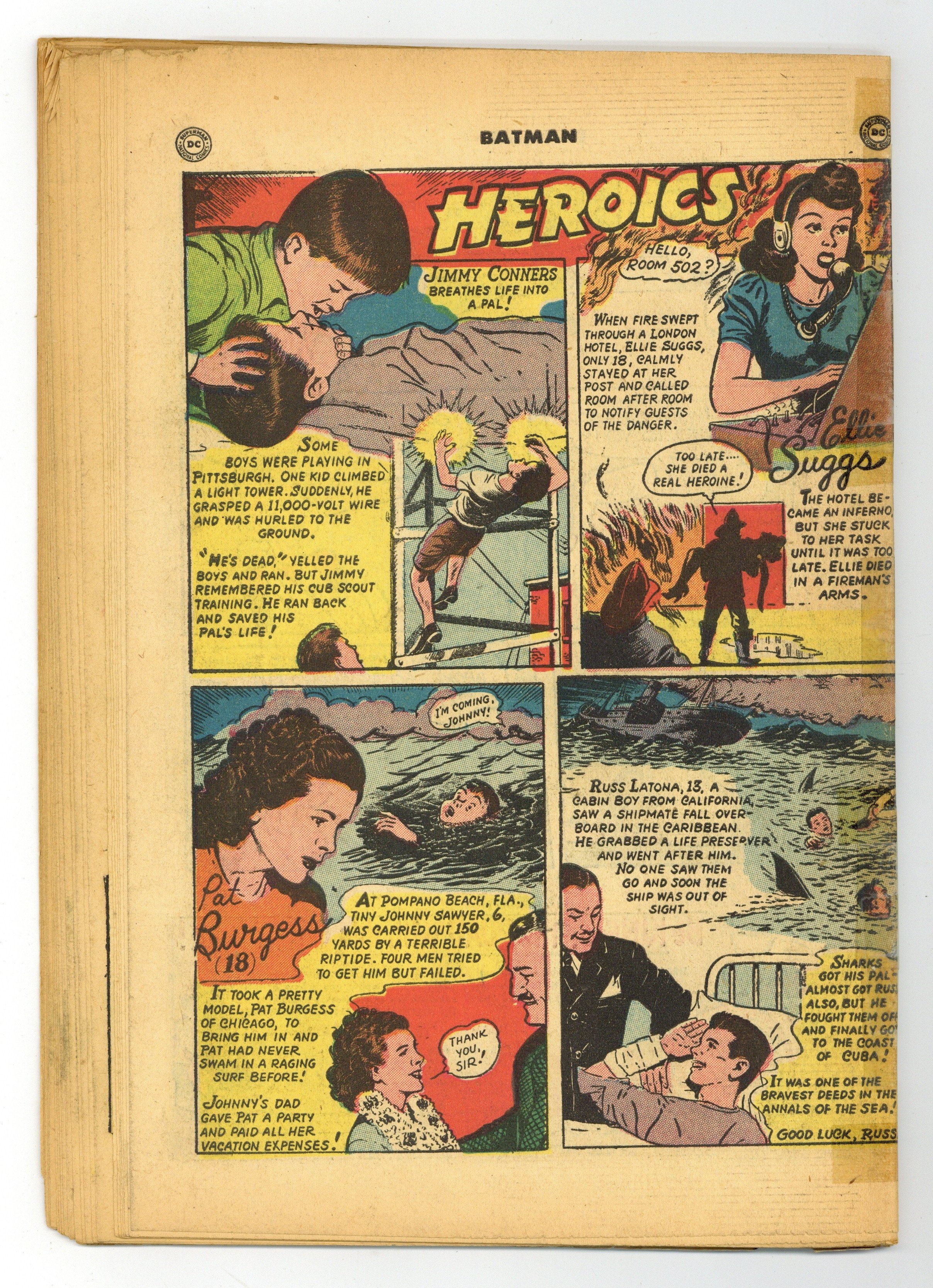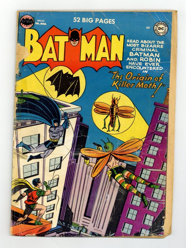 Cover pencils by Bob Kane (Batman and Robin figures only) and Lew Sayre Schwartz, inks by Charles Paris. "The Joker's Crime Costumes!", script by Bill Finger, pencils by Dick Sprang, inks by Charles Paris; Inspired by Batmans arsenal of Batsuits, the Joker begins a new crime spree with different costumes. "The Case of the Flying Saucers," pencils by Bob Kane (Batman and Robin figures only) and Lew Sayre Schwartz, inks by Charles Paris; When the death of a mysterious person reaches the Gotham City Police Department, Commissioner Gordon calls Batman and Robin; The clues indicate that the dead person is an alien from Saturn. Jerry the Jitterbug two-page story by Henry Boltinoff. -page Little Pete story by Henry Boltinoff. "The Origin of Killer Moth!", pencils by Bob Kane (Batman and Robin figures only) and Lew Sayre Schwartz, inks by Charles Paris; Prisoner #234026 reads a newspaper article about Batman and decides to set himself up as the "anti-Batman," hiring himself out to Gotham City's criminals to help them elude capture by Police; When released, he establishes a false identity as millionaire philanthropist and becomes friends with Bruce Wayne. -page Peg story by Henry Boltinoff. The World of Adventure in Books public service announcement starring Green Arrow, Tomahawk, and Shining Knight, script by Jack Schiff, art by Win Mortimer. One-page Tootsie Roll ad, "Captain Tootsie Cheers Orphans" by Bill Schreiber. 52 Pages, Full Color. Cover price $0.10. Grade: PR 0.5 explanation of grade Condition: Used (collectible)
