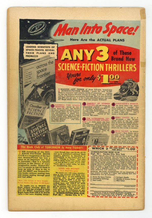 Cover art by Win Mortimer. Don't Give Fire a Place to Start! public service announcement starring Superboy, script by Jack Schiff, art by Win Mortimer. The Man Who Shadowed Batman! starring Batman and Robin, script by France Herron, pencils by Dick Sprang (as Bob Kane), inks by Charles Paris. The Doubles of Doom! starring Roy Raymond TV Detective, art by Ruben Moreira. The Case of the Cowardly Crew! starring Captain Compass, script by Otto Binder, art by Joe Certa. Whiz Cop article by Jack Miller (as Joe Masters). The Three Feats of Peril! starring Mysto Magician Detective, art by Leonard Starr. 44 pgs. $0.10. Cover price $0.10. Grade: GD- 1.8 explanation of grade Condition: Used (collectible)