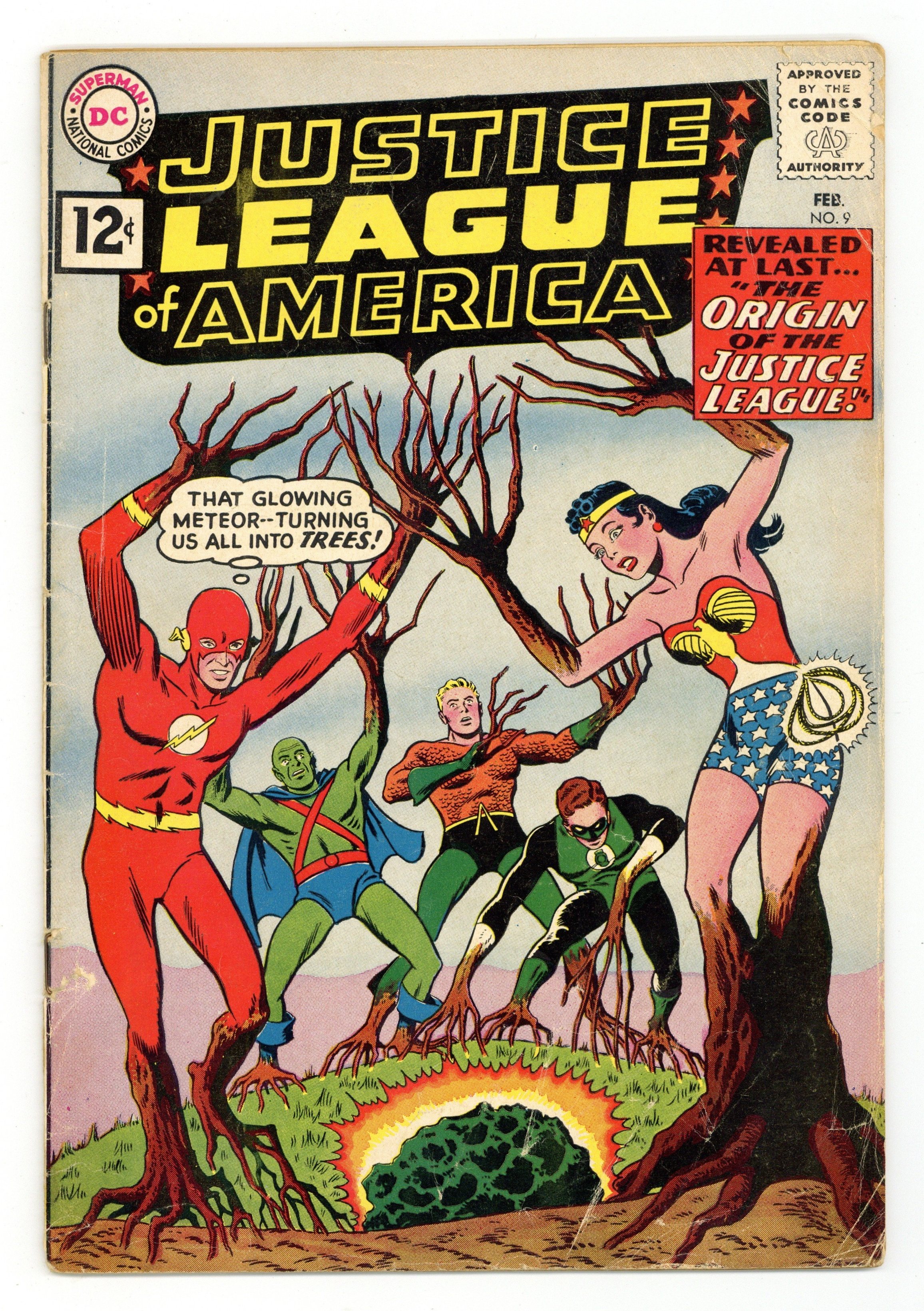 Starts Feb 2 Cover pencils by Mike Sekowsky, inks by Murphy Anderson. The Origin of the Justice League!, script by Gardner Fox, pencils by Mike Sekowsky, inks by Bernard Sachs; The Justice League of America uses the occasion of its third anniversary to tell Snapper Carr and Green Arrow about the formation of the League, involving the discovery of strange meteors that nearly doomed them forever; featuring the origin and first case of the JLA. Letter to the editor from comic artist Joe Staton. 36 pgs. $0.12. Cover price $0.12. Grade: FR/GD 1.5 explanation of grade Condition: Used (collectible)