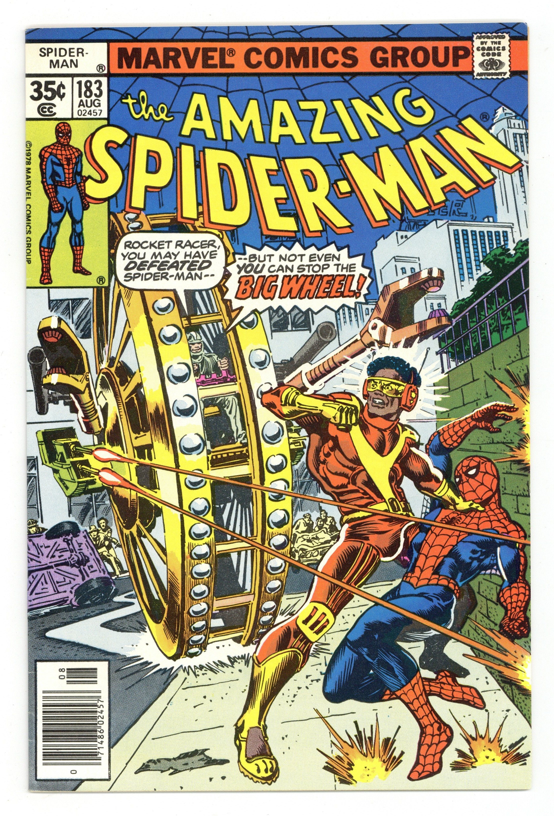 Starts Feb 9 "...And Where the Big Wheel Stops, Nobody Knows!" Part 2 of 2. Script by Marv Wolfman. Pencils by Ross Andru. Inks by Bob McLeod. Cover by Ross Andru and Ernie Chan. The Rocket Racer's extortion plan falls apart when the man he's blackmailing turns to the Terrible Tinkerer for help! And thanks to the old man's tinkering...the Big Wheel (aka Jackson Wheele) is born! The next day when the Big Wheel locates the Rocket Racer and the web-slinger (already fighting one another), the three-way battle begins! After the not-so-titanic tussle is over, Mary Jane finds Peter and gives him her answer. Perhaps someday she will change her mind. Cameo appearances by the Tinkerer, Toy, and Flash Thompson. (Notes: Mary Jane further explains why she turned down Peter's marriage proposal in Spectacular Spider-Man 21. Peter's second proposal takes place in Amazing Spider-Man 290. The Rocket Racer returns in Spectacular Spider-Man 104.) 36 pages. Cover price $0.35. Grade: VF- 7.5 explanation of grade Condition: Used (collectible)