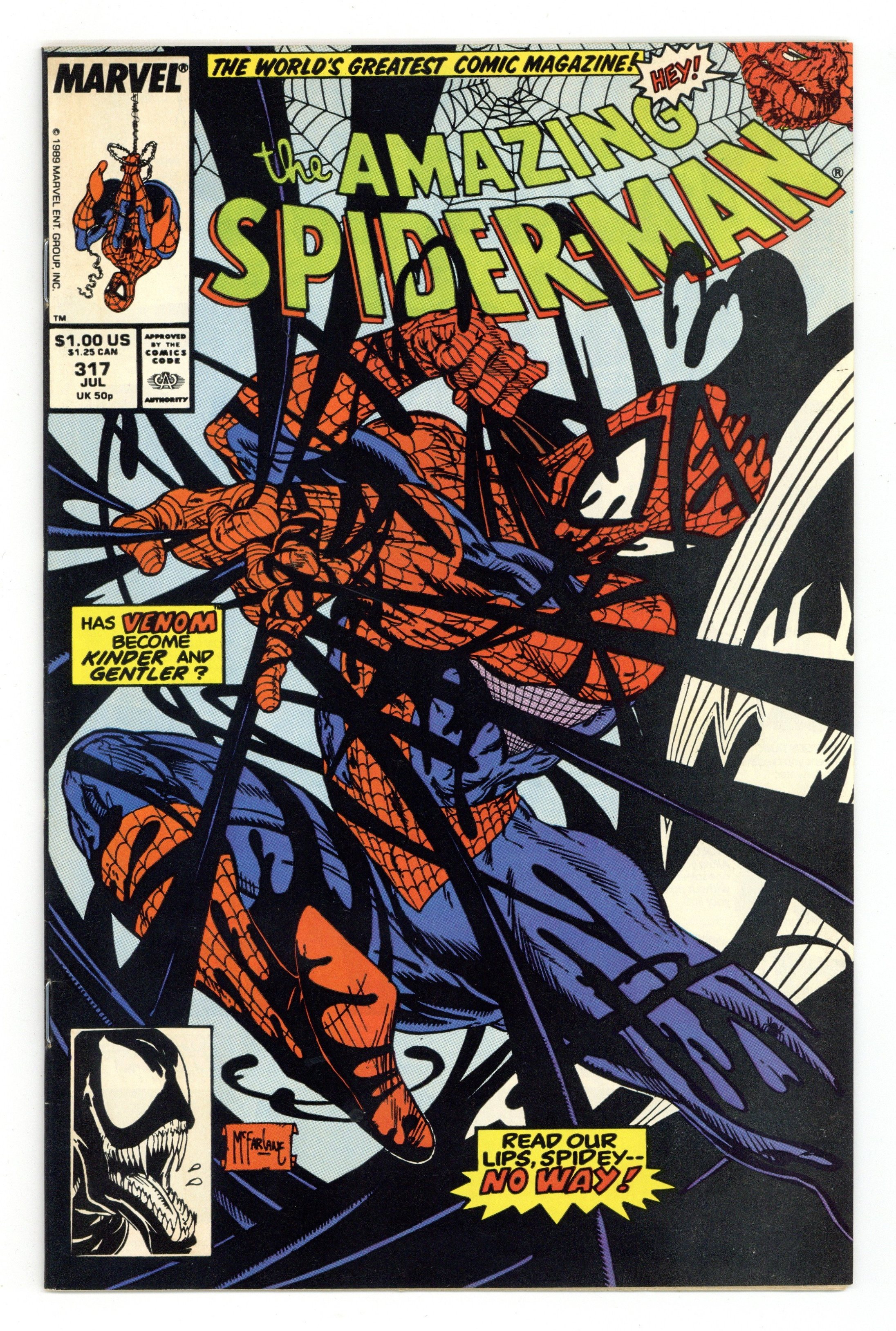 Starts Feb 9 "The Sand and the Fury!" Part 2 of 2. Script by David Michelinie. Art by Todd McFarlane. Cover by Todd McFarlane. After fleeing from Venom last issue, the web-slinger returns to the sanctuary of Aunt May's home in Queens! Peter and Mary Jane have only been living there for a few days and haven't had any visitors. But suddenly their first one knocks on the door: Venom! What?! Is the crazed villain going to slay Aunt May and her elderly boarders? No, the savage psychopath just stopped by to issue a challenge to her wall-crawling nephew! Meet in the morning at Montauk Point off Long Island Sound for a duel to the death! Wow, does the web-slinger have a chance vs. the overpowering Venom? The situation does not look good for your friendly neighborhood Spider-Man. Cameo appearance by the Thing (aka Ben Grimm). (Notes: Venom appears next in the Avengers' graphic novel: Death Trap The Vault. Venom returns to torment the web-slinger again in Amazing Spider-Man 332 & 333.) 36 pages. Cover price $1.00. Grade: VF- 7.5 explanation of grade Condition: Used (collectible)