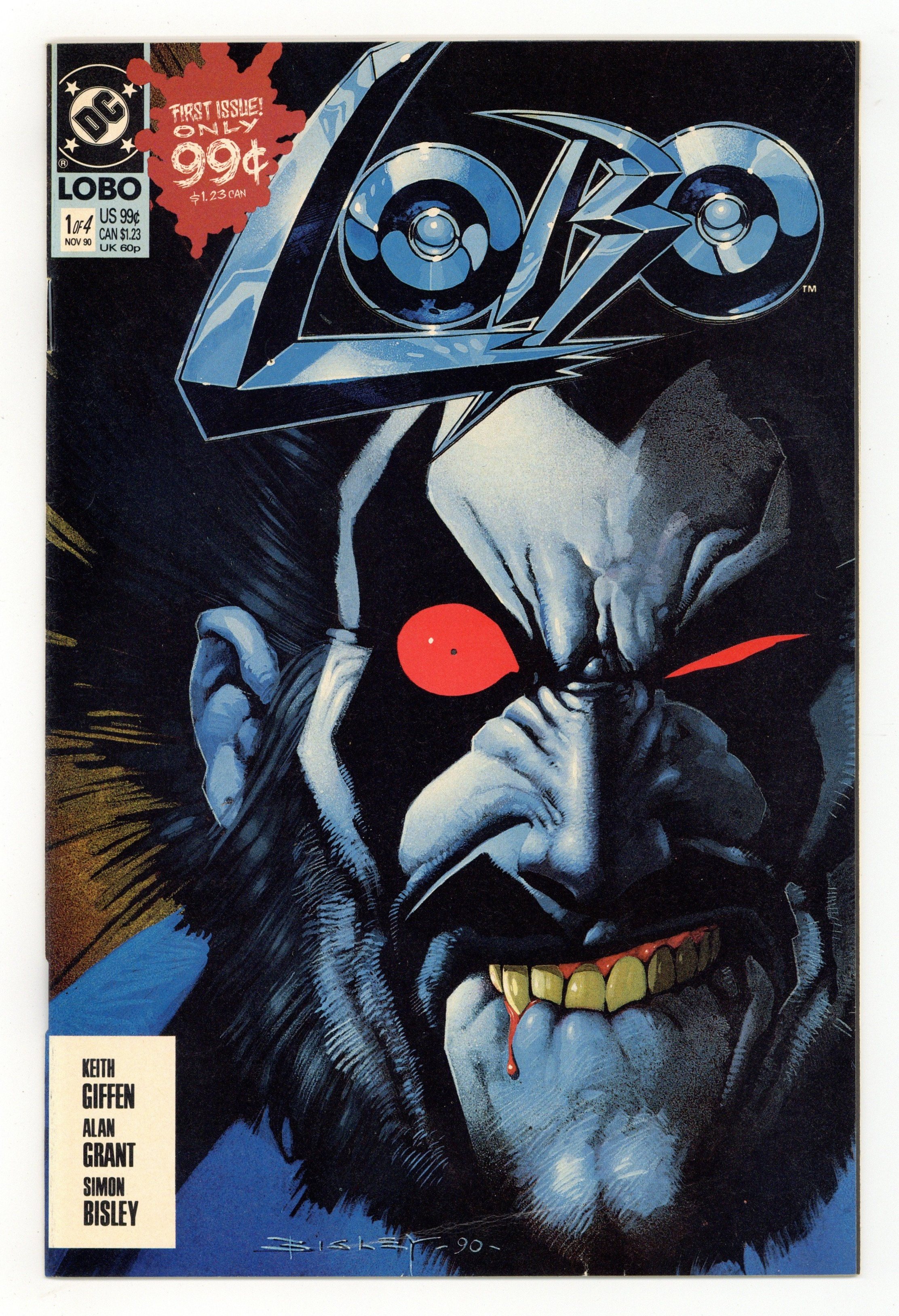 Starts Feb 9 Direct Edition. His name is Lobo. His job is intergalactic bounty hunter. His methods are insane. From the pages of L.E.G.I.O.N. '90 comes the wild, unchained, devil-may-care character you love to hate in his first solo mini-series. And if you thought he was out of control before, wait until you see what happens here. You see, Lobo is the last survivor of his race...an entire civilization that he personally annihilated just because he wanted to be unique in the universe. But Lobo seems to have missed one, and now that survivor's gone and written an unauthorized biography of Lobo, which doesn't make our maniac very happy. But what's really got Lobo miffed is that he's accepted a contract from L.E.G.I.O.N. to escort his biographer across the universe to their headquarters - delivered alive! Of course, Lobo manages to make a few enemies along the way, complicating his mission as these factions embark on a wild chase across the cosmos to see who will get to Lobo first. Written by Keith Giffen and Alan Grant, with art and painted cover by Simon Bisley. New Format. Cover price $0.99. Grade: FN- 5.5 explanation of grade Condition: Used (collectible)