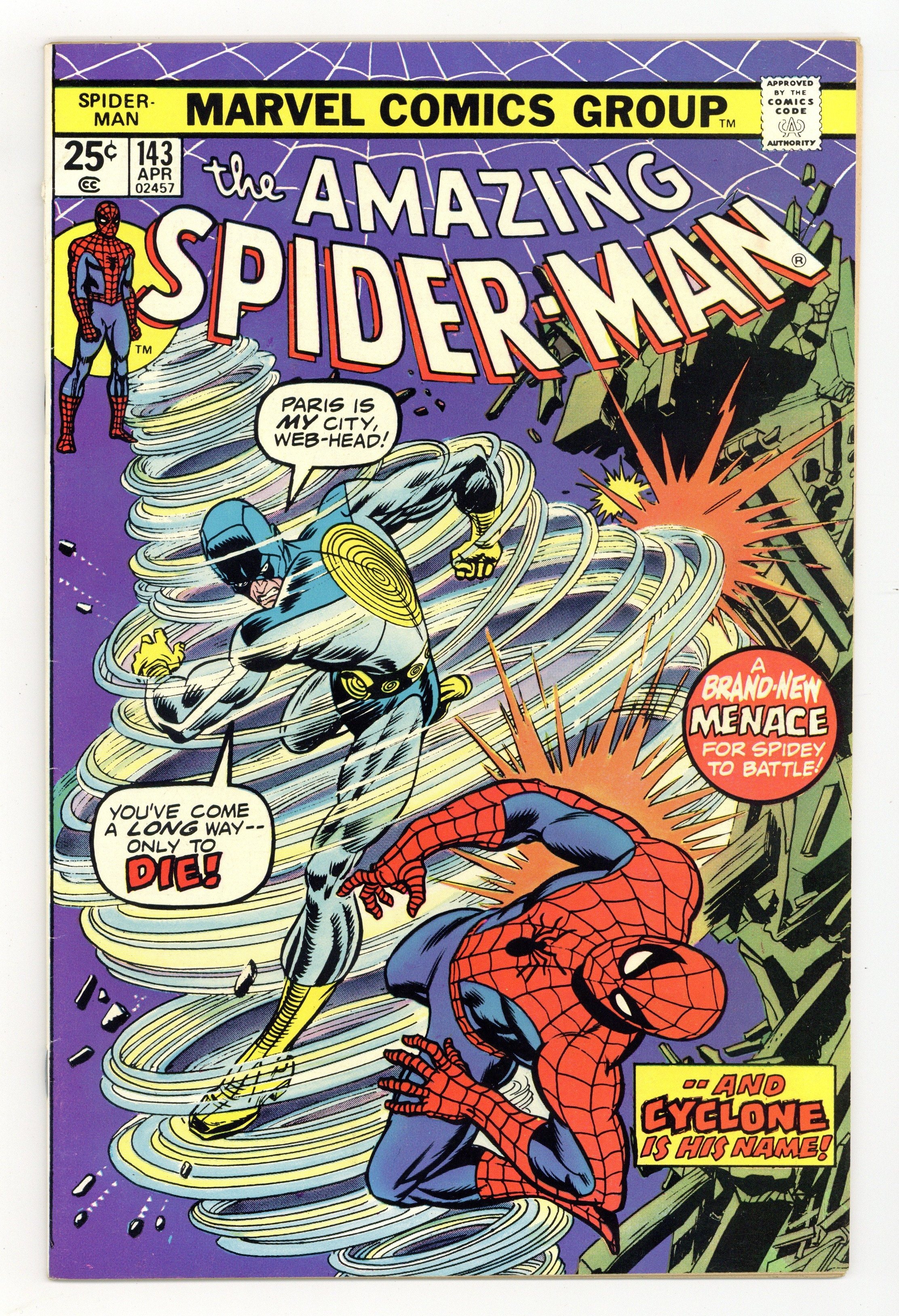 Starts Feb 2 "...And the Wind Cries: Cyclone!" Part 1 of 2. Script by Gerry Conway. Pencils by Ross Andru. Inks by Frank Giacoia and Dave Hunt (backgrounds). Cover by Gil Kane and John Romita. The irrepressible J. Jonah Jameson has been kidnapped in the City of Lights! So Joe Robertson and Peter Parker rush to Paris, France to rescue their boss! The treacherous search for the Daily Bugle publisher leads from the Place Vendôme to the Arc de Triomphe to the Eiffel Tower! Where the Amazing Spider-Man clashes with a new international adversary: The Cyclone! The whirlwind-like villain boasts that he has Jonah! And also, that the web-slinger better meet the ransom demands…or face his own Waterloo! First appearance of the Cyclone. Cameo appearances by Mary Jane Watson, Betty Brant, Flash Thompson, Liz Allan, Professor Miles Warren, and the Gwen Stacy clone. Flashback cameo by Mysterio. (Notes: This issue features the memorable first kiss between Peter and Mary Jane at Kennedy Airport. The letters page includes a letter from comics publisher Dean Mullaney. Giant-Size Spider-Man 4 featuring the third appearance of the Punisher was also published this month. This story was reprinted in Marvel Tales 120.) 36 pages. 25c cover price. Cover price $0.25. Grade: FN/VF 7.0 explanation of grade Condition: Used (collectible)