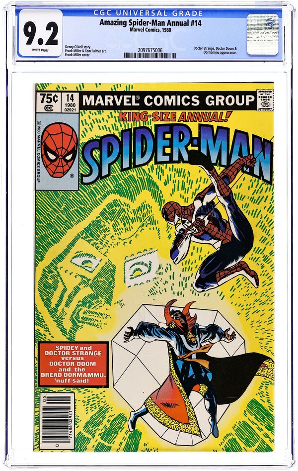 Starts Feb 9 Newsstand Edition. "The Book of the Vishanti" Guest-starring Doctor Strange. Script by Denny O'Neil. Pencils by Frank Miller. Inks by Tom Palmer. Cover by Frank Miller. Doctor Doom and the Dread Dormammu conspire to bring the Bend Sinister phenomenon to Earth's dimension! And the Master of the Mystic Arts is the only person who understands the great evil that now threatens the planet! However Doom and Dormammu's earthly pawn captures Dr. Strange with a surprise attack in Greenwich Village! But before the good doctor goes down, he sends forth a psychic flare for help...to any superhero available in the Big Apple! On this moonlit night, there is only one hero present to answer the call: the Amazing Spider-Man! The web-slinger usually deals with modest villains and small-time criminals; but tonight, the wall-crawler tangles with the heavyweights! Earth's precarious future lies in the hands of your friendly neighborhood Spider-Man! (Notes: This issue features outstanding artwork by Frank Miller and Tom Palmer. This story was reprinted in Marvel Tales 200 and also in the (1994) Complete Frank Miller Spider-Man.) 52 pages. Cover price $0.75. Grade: CGC 9.2 explanation of grade Condition: Used (collectible)