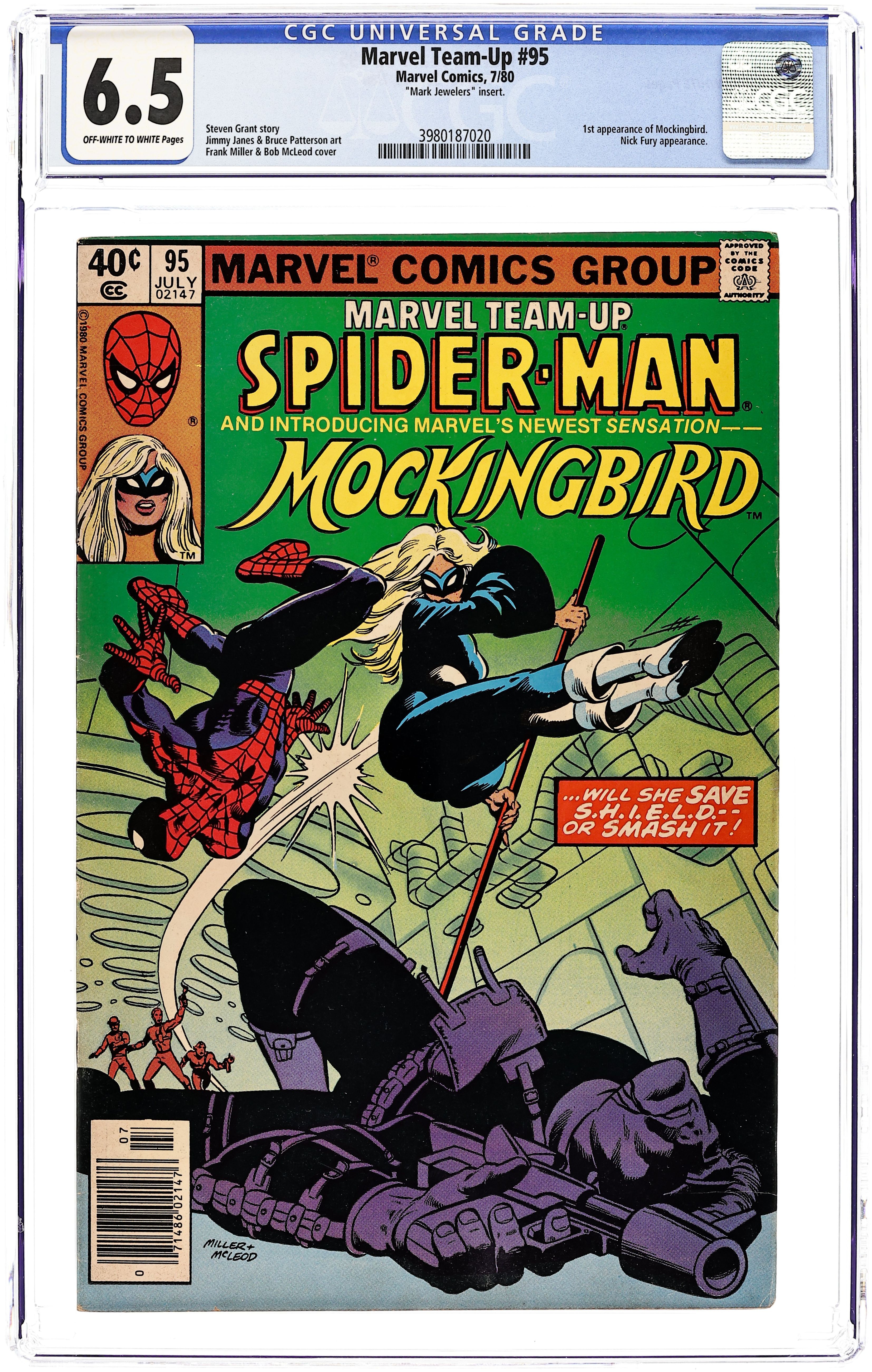Mark Jeweler Advertisement Insert Variant. "And No Birds Sing!" Guest-starring Spider-Man and Mockingbird (1st appearance). Script by Steven Grant. Art by Jimmy James (breakdowns) and Bruce Patterson (finishes). Cover by Frank Miller and Bob McLeod. A rogue SHIELD branch director tricks the web-slinger into believing that Nick Fury's life is in jeopardy! Specifically from a former SHIELD operative...Barbara Morse! However, Mockingbird is actually trying to save Nick Fury. Will Spider-Man realize that in time? First appearance of Bobbi Morse as Mockingbird. (Notes: After a cameo appearance in Contest of Champions 1, Mockingbird appears next in the first Hawkeye Limited Series published in 1983. The letters page contains a brief essay from Mark Gruenwald about the creation of Mockingbird.) 32 pages Cover price $0.40. Grade: CGC 6.5 explanation of grade Condition: Used (collectible)