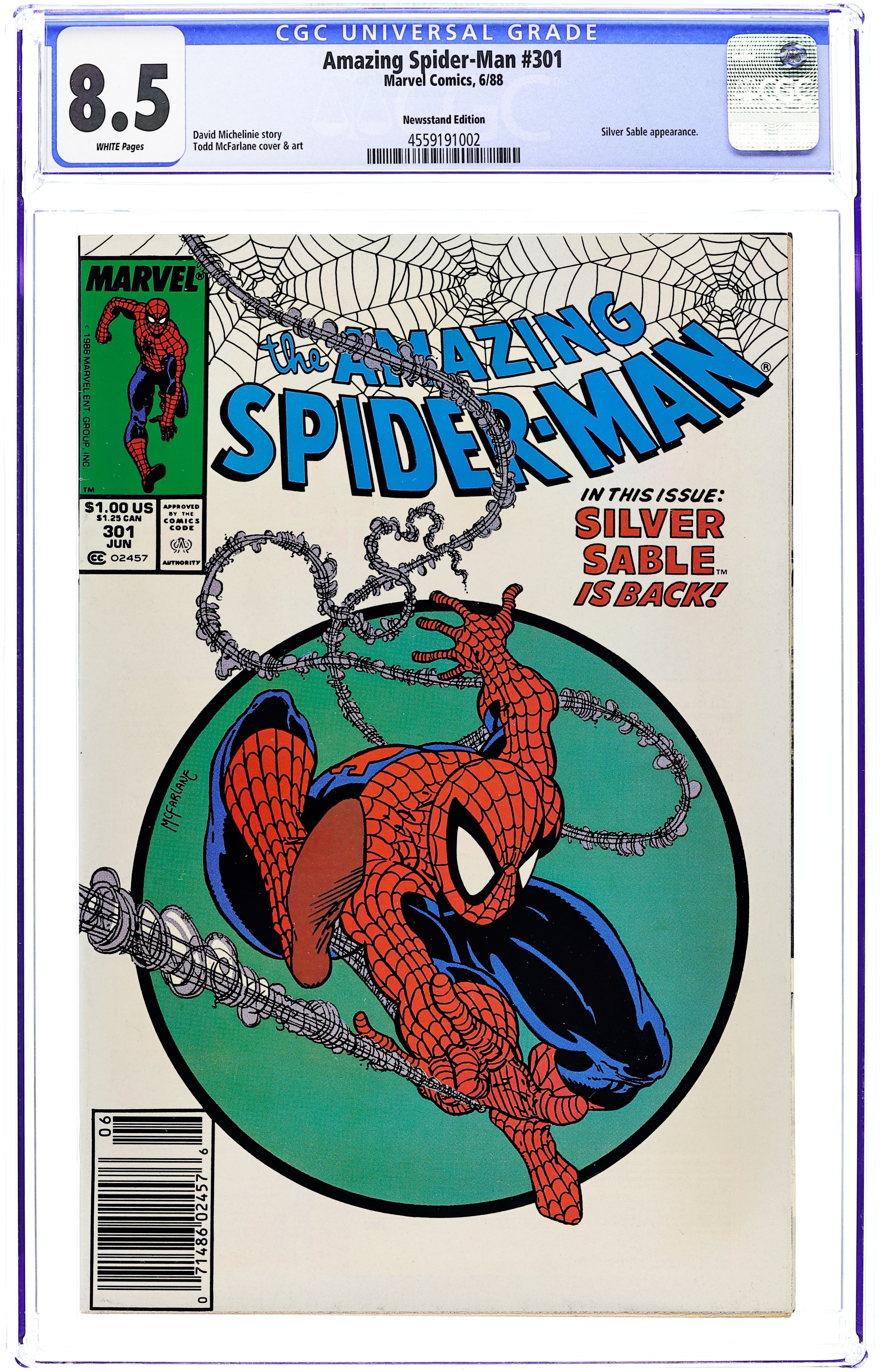 Newsstand Edition. "The Sable Gauntlet!" Guest-starring Silver Sable. Script by David Michelinie. Art by Todd McFarlane. Cover by Todd McFarlane. The first 300 issues of the Amazing Spider-Man are in the books after the web-slinger's epic battle vs. Venom last issue! And now the next chapter in the wall-crawler's anthology begins with an encounter with his favorite mercenary: Silver Sable! The enchanting sable agrees to make a test run through the security systems of a new high-rise office building, but deadly danger awaits on the top floor! Will Spidey catch the elevator in time? Cameo appearances by Mary Jane Watson and Dr. Morris Sloan. First $1.00 issue. (Notes: The cover is the same artwork (with different colors) as the cover to issue 300. This issue includes a full-page ad for the first appearance of Typhoid Mary in the Daredevil (1st) series -- art by John Romita Jr. and Al Williamson. The letters page contains a statement of ownership: average print run 469,913; average paid circulation 284,692.) 36 pgs. Cover price $1.00. Grade: CGC 8.5 explanation of grade Condition: Used (collectible)