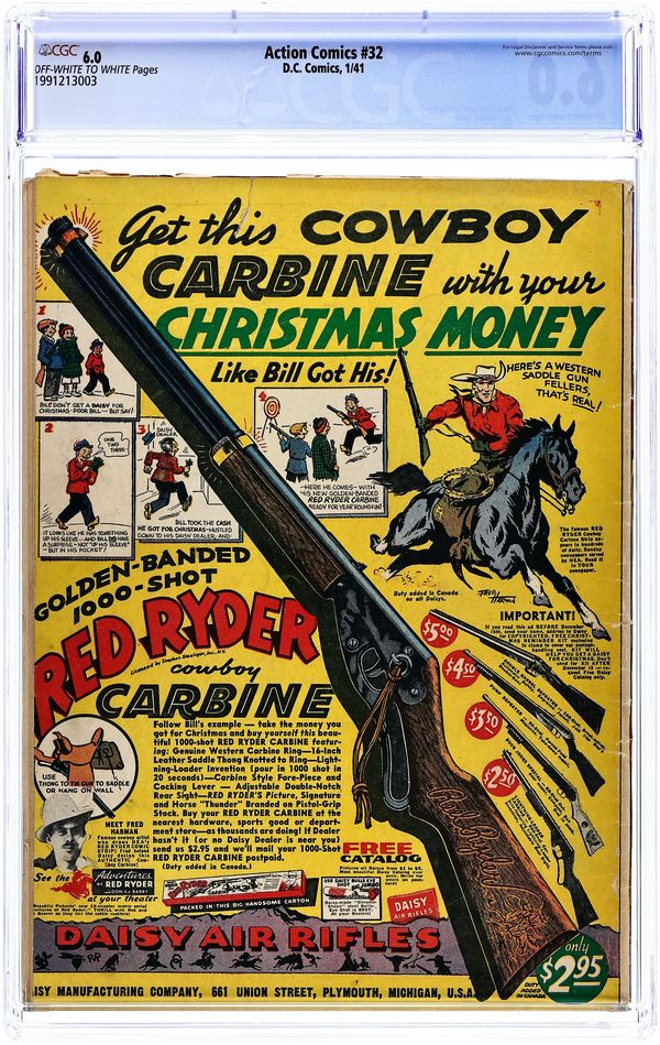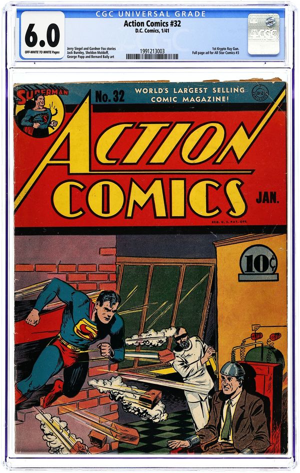 Cover art by Joe Shuster and Leo Nowak. Superman story, script by Jerry Siegel, art by Jack Burnley (signed as Joe Shuster). 1st app. Krypto raygun. Pep Morgan story, art by George Papp. The Black Pirate story, art by Sheldon Moldoff. Three Aces story, script by Gardner F. Fox, art by Chad Grothkopf. Tex Thomson story, script by Ken Fitch, art by Bernard Baily. Clip Carson story, art by George Papp. Zatara story, script by Gardner F. Fox, art by Joseph Sulman. 68 Pages, Full Color. $.10 Cover price $0.10. Grade: CGC 6.0 explanation of grade Condition: Used (collectible)