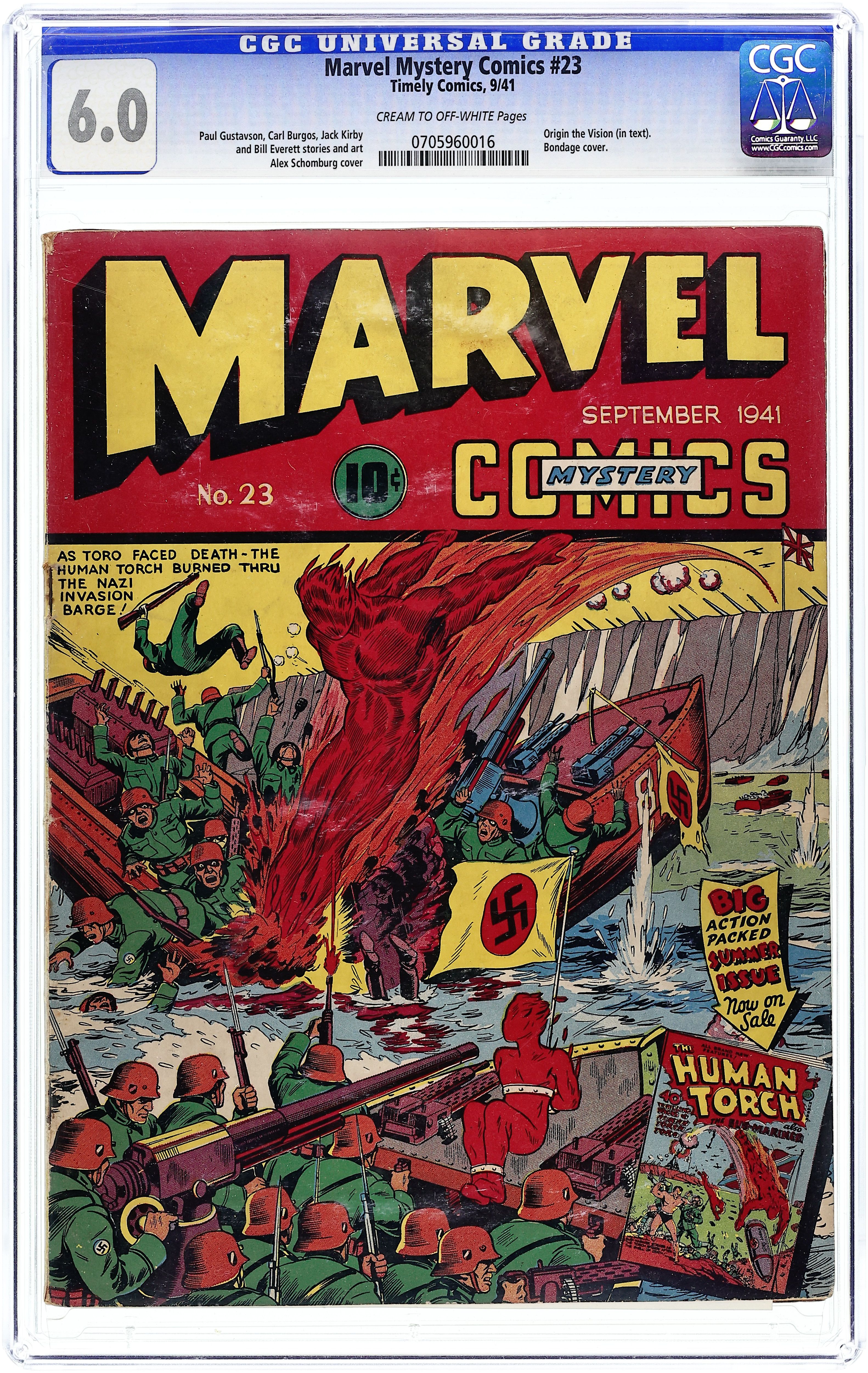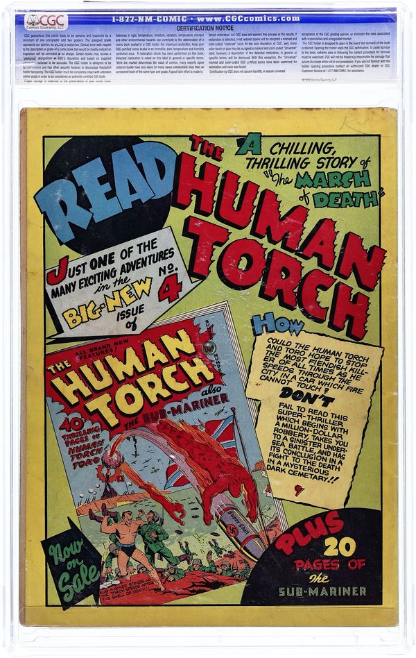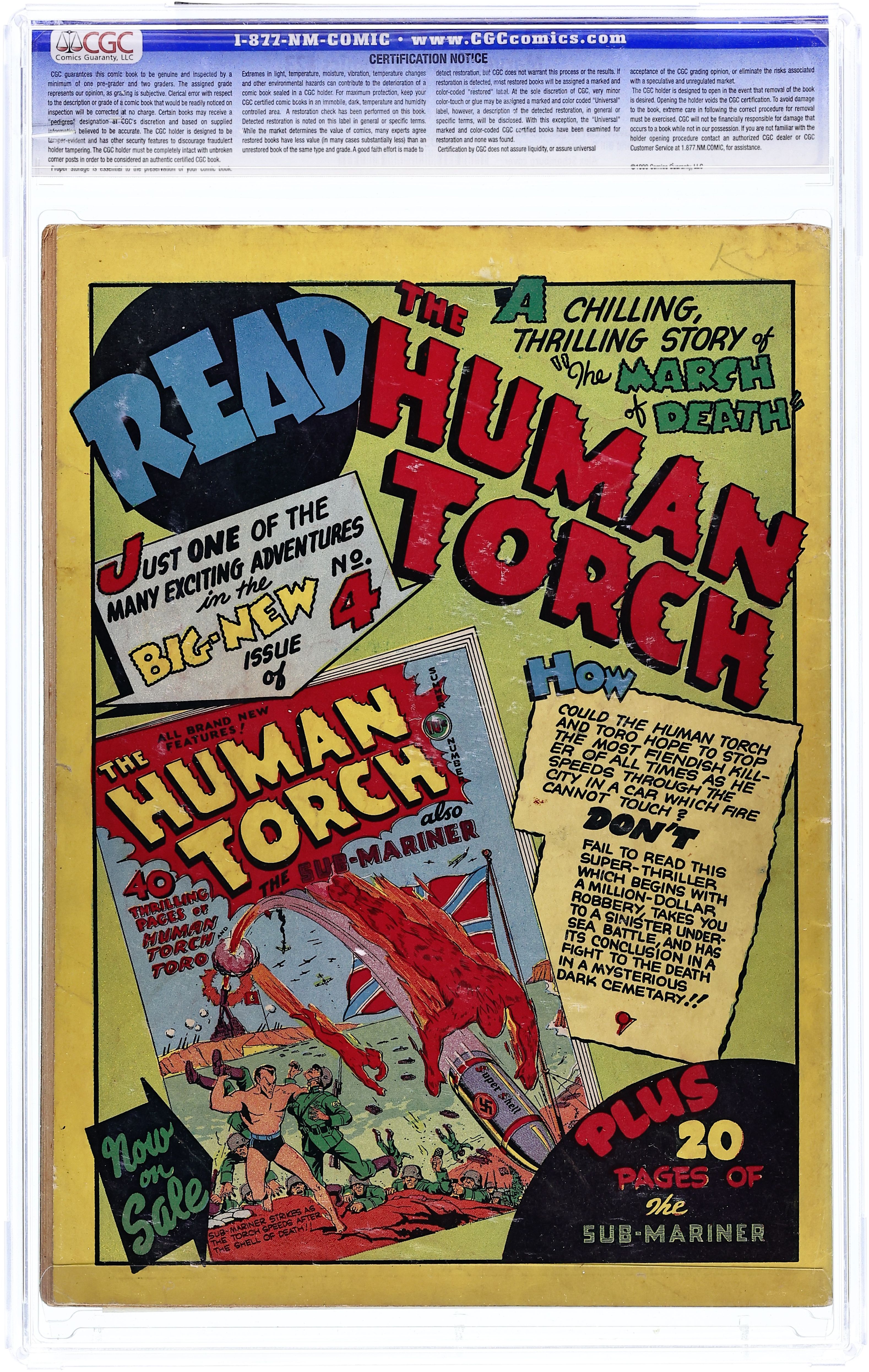 Cover art by Alex Schomburg. Sub-Mariner Comics 2 ad. "Highway of Mystery" starring The Human Torch, story and art by Carl Burgos; N-4, a Nazi saboteur, has infiltrated the Topper Tank factory as an executive secretary; She has her men build a hideout above a superhighway so that she can drop a ramp to capture experimental models of a new tank during transit. She is finally unmasked by the Torch and Toro. "The Case of the Vanishing Convicts!", script and art by Bill Everett; Namor has to overcome a mad scientist who is trying to create a race of evil Sub-Mariners to war against America! Patriot untitled story, script by Ray Gill, art by Art Gates; The Patriot puts an end to the murderous activity of a self-confessed Bundsman, who wanted to end a play that was anti-Nazi. "The Vision Speaks" text story, script by Stan Lee. The Vision untitled story, script by Jack Kirby and Joe Simon, pencils by Kirby, inks by Simon; The Vision comes to Earth to investigate the sacrificing of humans to the mysterious Kai-Mak, the Shark-God. Ka-Zar the Great untitled story, art by Ben Thompson; Ka-Zar ends his battle with the Nazis, who are attempting to establish an air base in the African jungle. "The Mystery of the Green Diamond" starring Terry Vance, script by Ray Gill, art by Bob Oksner; Terry and Deadline are invited to a swanky party thrown by the mayor, then must investigate the disappearance of the green diamond necklace worn by the mayor's wife. Angel untitled story, art by Paul Gustavson; The Angel is at Inferno Isle and discovers that the Temple of Fire located there is masking a secret Nazi base. Human Torch Comics ad. 68 pages. Cover price $0.10. Grade: CGC 6.0 explanation of grade Condition: Used (collectible)