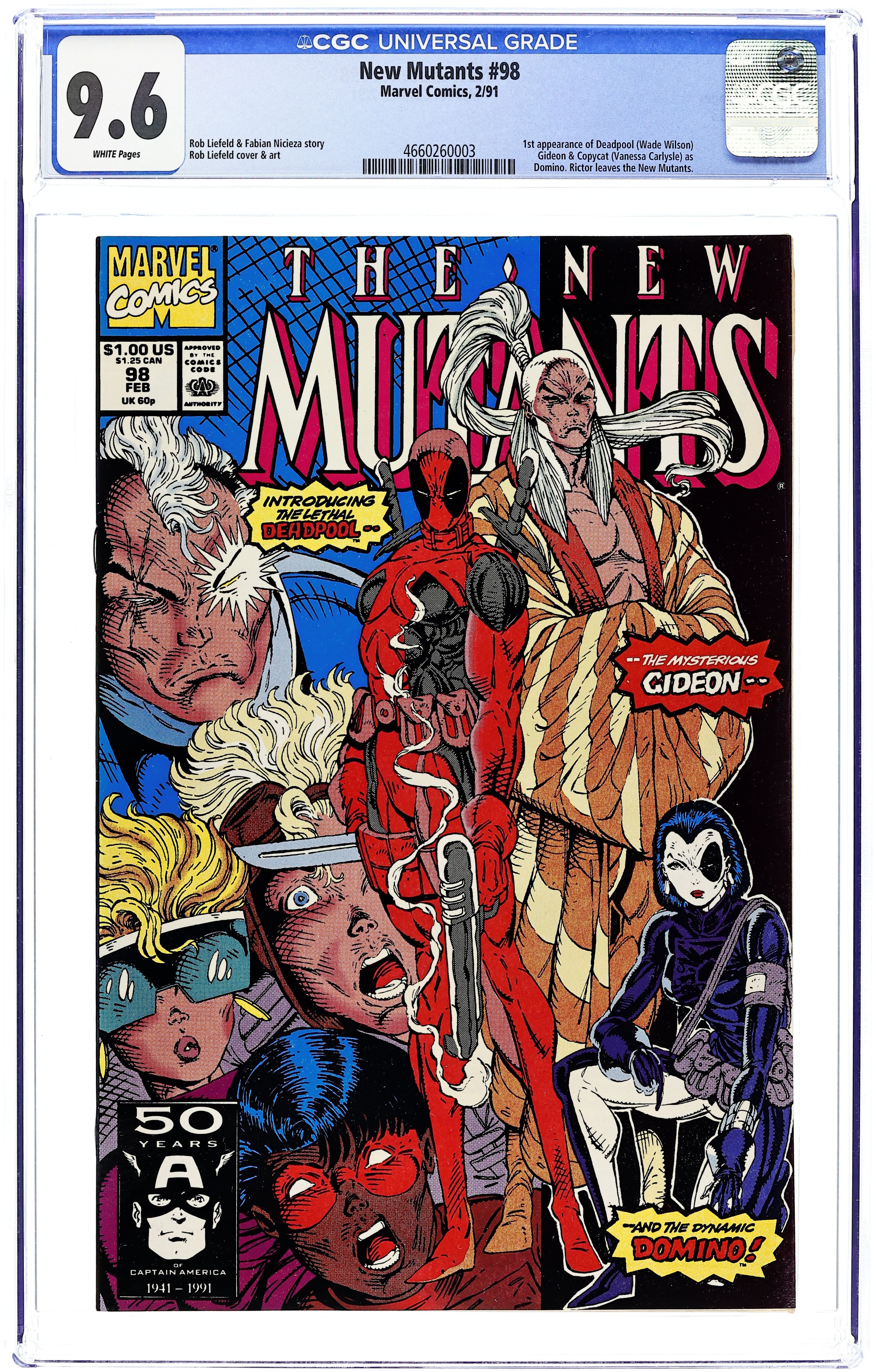 1st appearance of Deadpool, Gideon, and Domino (Impersonated by Copycat). Cover pencils by Rob Liefeld. The Beginning of the End, Part One, script by Rob Liefeld (plot) and Fabian Nicieza (script), art by Rob Liefeld; Gideon arranges for the murder of Sunspot's father; Deadpool, working for Mr. Tolliver, attacks Cable; Domino defeats him; Cable and Domino plot strategy; Rictor decides to go after Wolfsbane, who stayed in Genosha; Gideon tells Sunspot his father is dead. Part 1 of 3. 36 pgs. The Domino that appears in this issue is actually the mutant known as Copycat. The real Domino makes her first real appearance in he pages of X-Force (1991-2002 1st Series) #8 and 11. Cover price $1.00. Grade: CGC 9.6 explanation of grade Condition: Used (collectible)