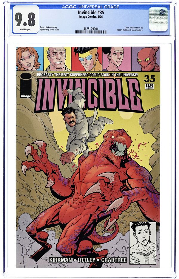 Story by ROBERT KIRKMAN. Art & cover by RYAN OTTLEY & BILL CRABTREE. What are Nolan's books and why did he tell Mark it was so important to read them? What stories do they tell, and how are they tied into the current events of his life? Secrets are revealed, and the stage is set for the next chapter in Invincible's life -- and it's all leading up to the monumental issue 50. ? 32 pg ? FC ? . Cover price $2.99. Grade: CGC 9.8 explanation of grade Condition: Used (collectible)