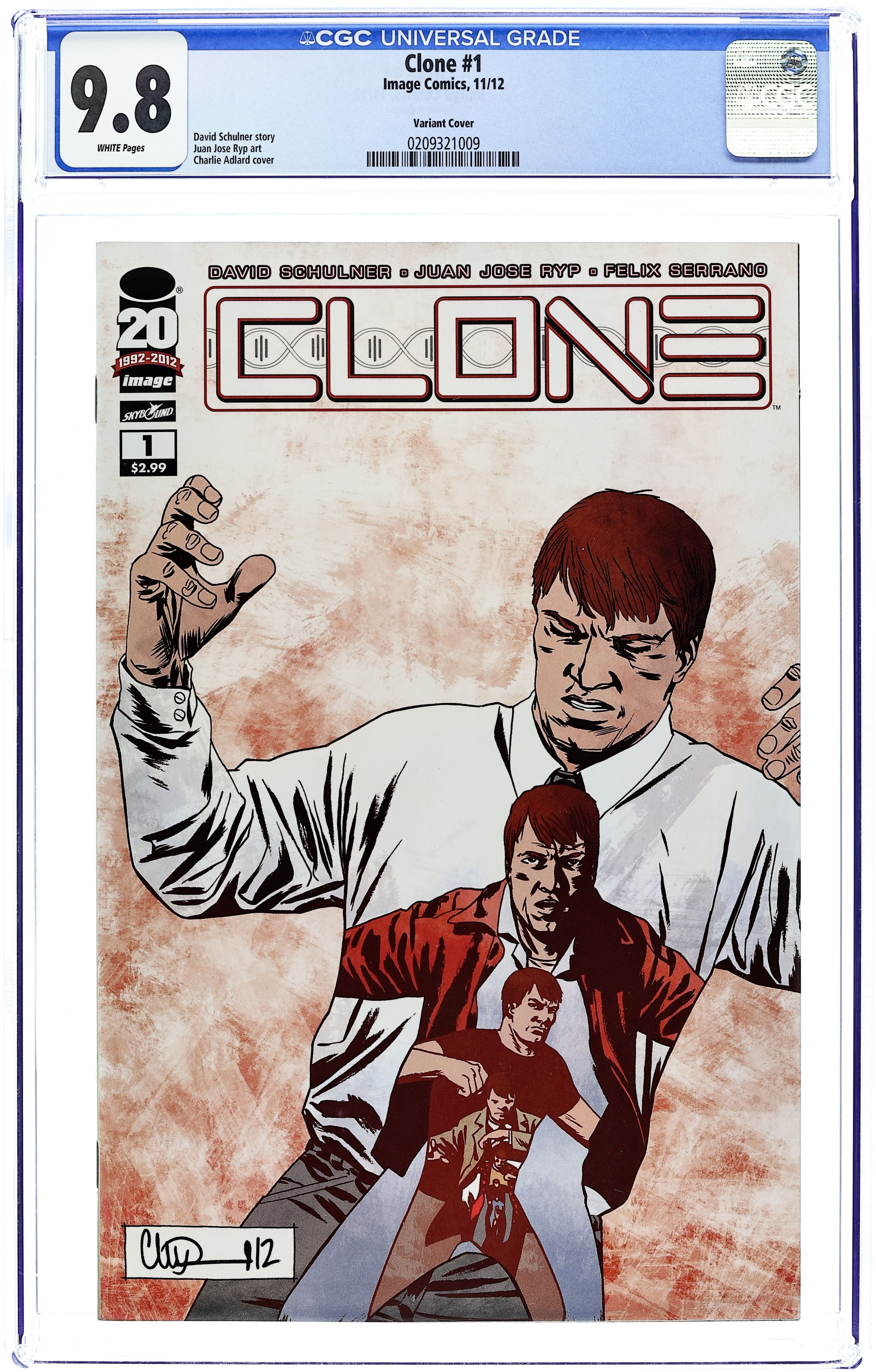 Starts Feb 16 Variant Cover By Charlie Adlard, (W) David Schulner (A) Juan Jose Ryp, Felix Serrano From ROBERT KIRKMAN's Skybound imprint, comes a sci-fi story like you've never seen before! Dr. Luke Taylor's perfect life comes to a dramatic halt when an identical, bloodied version of himself arrives at his doorstep with news that he is one of many clones... and they're all after his pregnant wife and their unborn child! Cover price $2.99. Grade: CGC 9.8 explanation of grade Condition: Used (collectible)