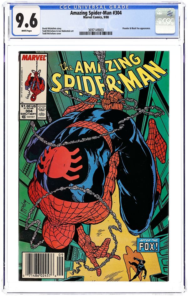 Starts Feb 9 Newsstand Edition. "California Schemin'!" Part 1 of 2. Script by David Michelinie. Pencils by Todd McFarlane. Finishes by Joe Rubinstein. Cover by Todd McFarlane. The Daily Bugle publishes a book featuring Peter Parker's best photos of Spider-Man! And now the Bugle's ace photographer and Mary Jane are on their way to Los Angeles for the publicity tour! It should be all fun in the sun in the city of angels! But Peter's first promotional event at the L.A. civic center hits a snag when an old acquaintance shows up: the Black Fox! The wily fox steals a priceless chalice and the chase is on! Is the web-slinger ready for his Hollywood debut? Cameo appearances by Aunt May, J. Jonah Jameson, and the Prowler. First appearance of Jonathan Caesar. (Notes: The Black Fox previously appeared in Web of Spider-Man 15. The Amazing Spider-Man title was published bi-monthly for the next 5 issues.) 36 pgs. Cover price $1.00. Grade: CGC 9.6 explanation of grade Condition: Used (collectible)