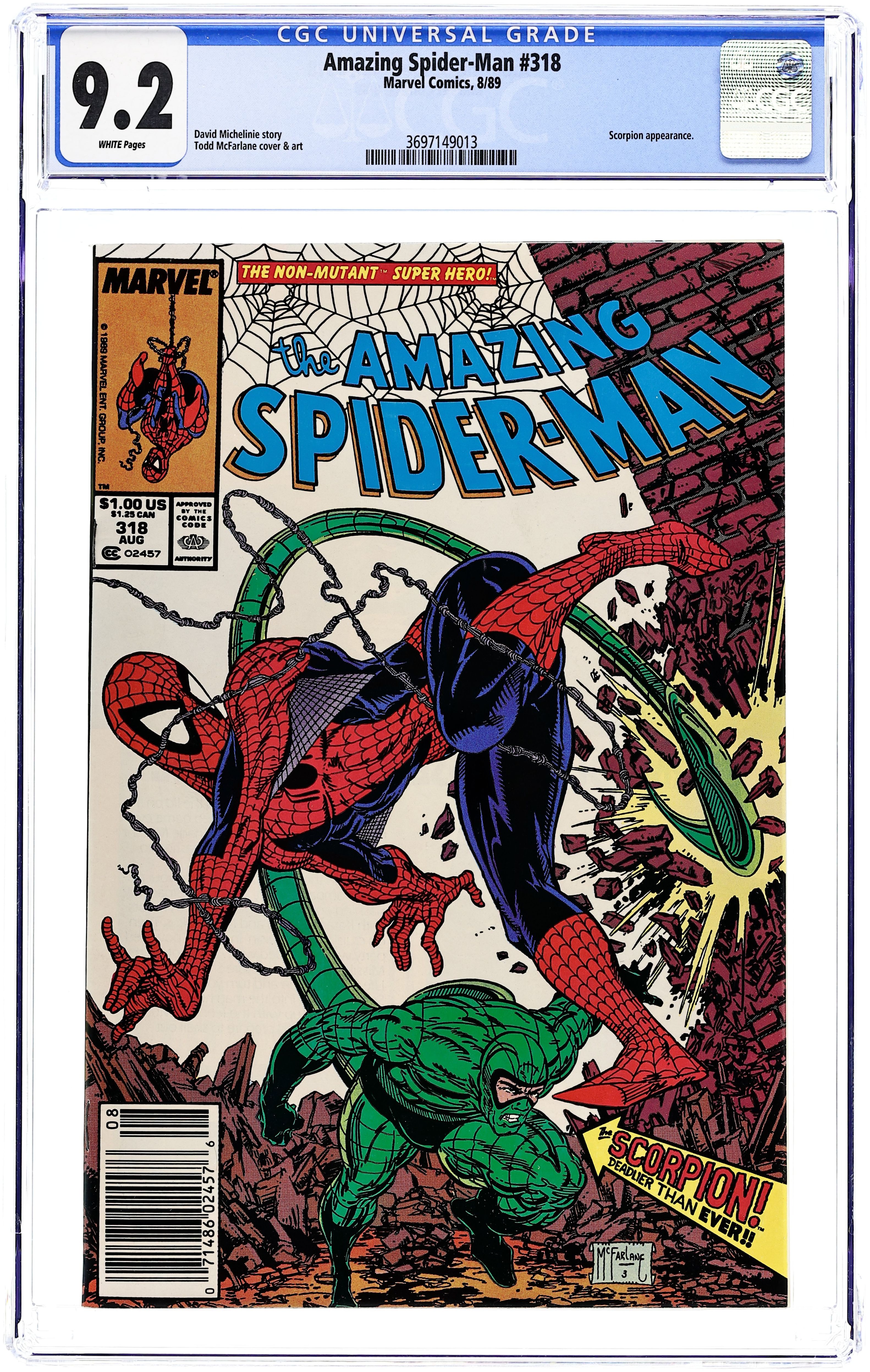 Starts Feb 9 Newsstand Edition. "Sting Your Partner!" Part 1 of 2. Script by David Michelinie. Art by Todd McFarlane. Cover by Todd McFarlane. With new armament from Justin Hammer, the sinister Scorpion is back in business! But before Mac Gargan can resume his personal agenda, he has to do a job for Mr. Hammer! Fortunately, it's a fairly simple one: kidnap an army general from the Brooklyn National Guard Armory and hand him over to Hammer Industries! However, both Lance Bannon and the wondrous wall-crawler are also at the armory taking pictures for the Daily Bugle! When the Scorpion hears the name of the hated J. Jonah Jameson, he decides to go off-script! And he will regret that decision...post-haste! Cameo appearances by Mary Jane Watson, Harry Osborn, and the Chameleon. (Note: The Scorpion previously appeared in Amazing Spider-Man Annual 18.) 36 pages. Cover price $1.00. Grade: CGC 9.2 explanation of grade Condition: Used (collectible)
