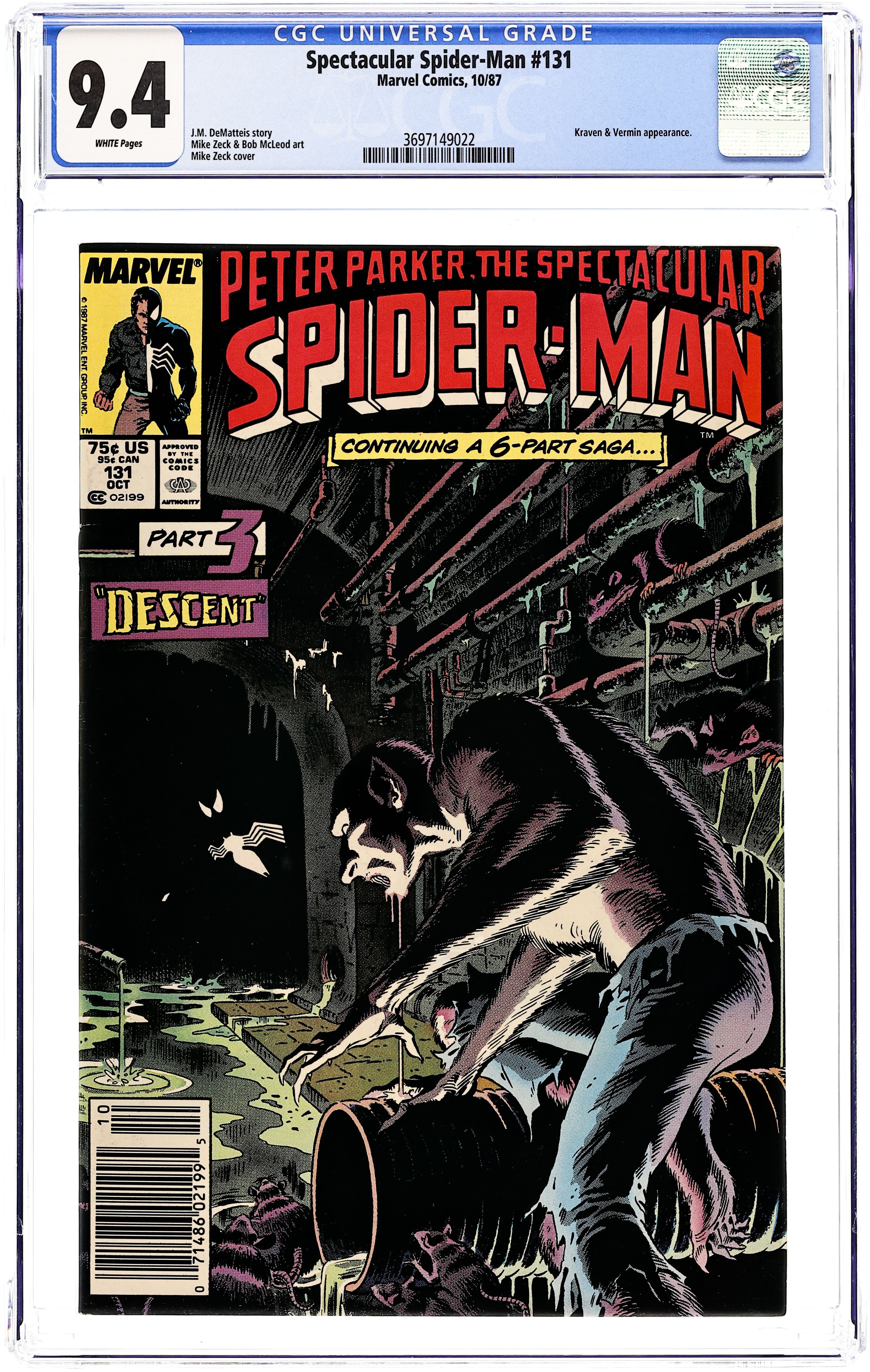 Starts Feb 9 Newsstand Edition. Kraven's Last Hunt - Part 3 of 6 - "Descent" Script by J. M. DeMatteis. Pencils by Mike Zeck. Inks by Bob McLeod. Story continues from Amazing Spider-Man 293. Kraven is basking in the glow of his triumph over Spider-Man as he has successfully taken over the web-slinger's crime fighting activities with a new violent twist, while the spectacular one lies six feet under. However, there is another vicious villain terrorizing the city...Vermin! The human rat is Kraven's next target, and a savage battle between the two killers erupts in the sewer system! Meanwhile, Mary Jane is frantically searching for Peter and visits Joe Robertson looking for help. Story continues in Web of Spider-Man 32. 32 pages Cover price $0.75. Grade: CGC 9.4 explanation of grade Condition: Used (collectible)