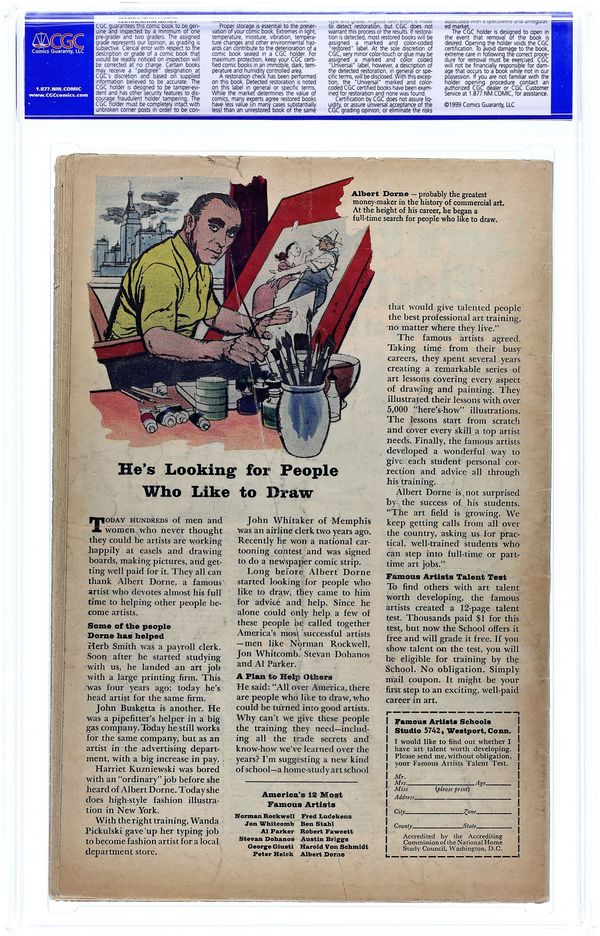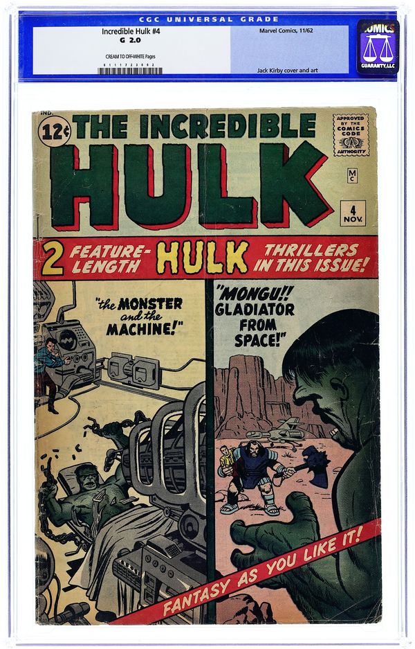 Cover pencils by Jack Kirby, inks by Dick Ayers. "The Monster and the Machine!," script by Stan Lee, pencils by Jack Kirby, inks by Dick Ayers; Rick uses some of Banner's machinery to transform the Hulk, who was stuck in his monster persona, back into Bruce. "The Gladiator from Outer Space!," script by Stan Lee, pencils by Jack Kirby, inks by Dick Ayers; An alien invades Earth and claims his people will conquer the planet unless he is met in battle by the strongest opponent the world has to offer; Hulk meets the challenge but finds out it is all a ploy by the Russians to capture him and create an army of hulks of their own. 36 pgs., full color. $0.12. Cover price $0.12. Grade: CGC 2.0 explanation of grade Condition: Used (collectible)