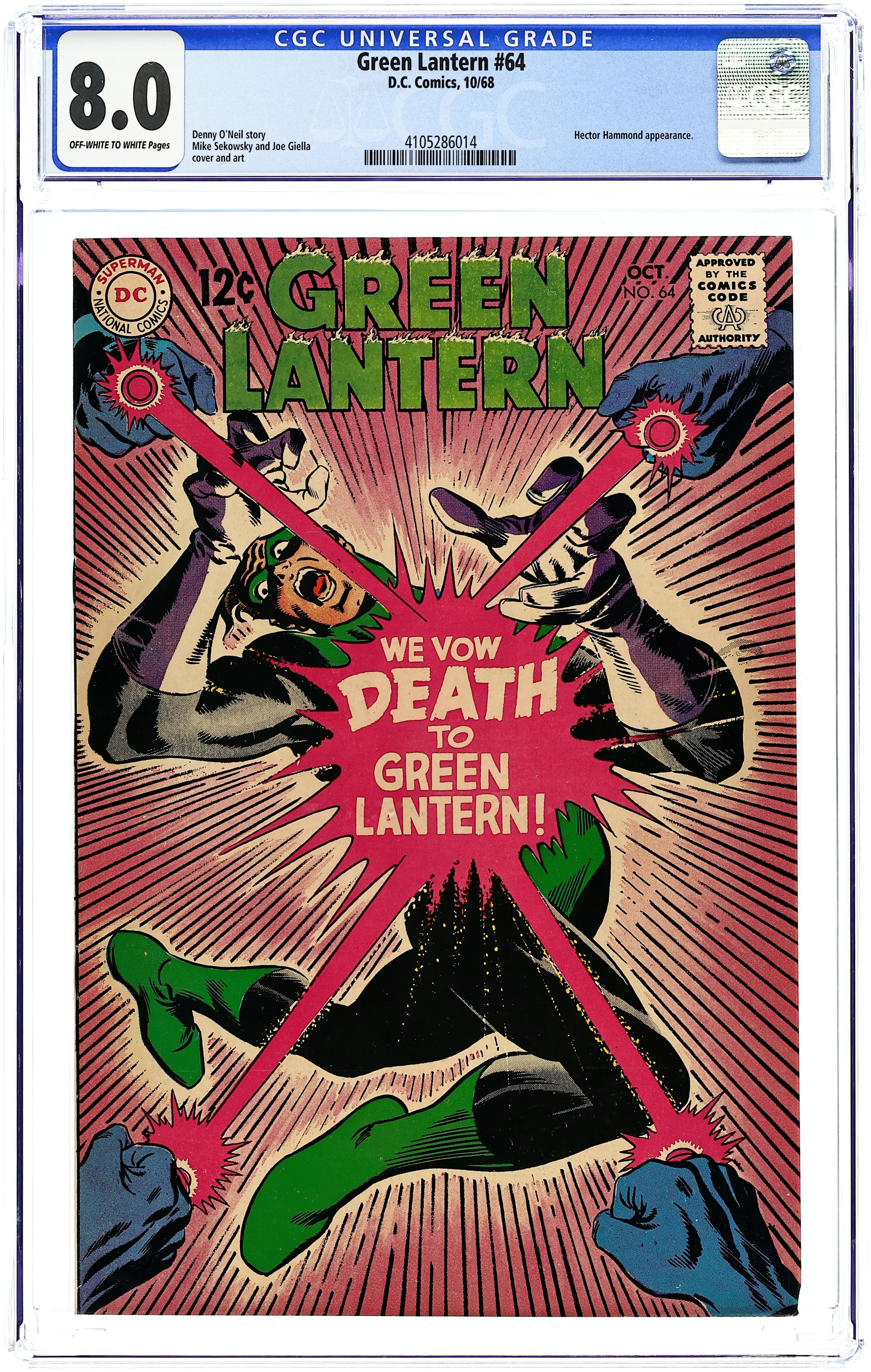 Starts Feb 9 Cover pencils by Mike Sekowsky, inks by Joe Giella. Death to Green Lantern, script by Denny O'Neil, pencils by Mike Sekowsky, inks by Joe Giella; Hector Hammond devises a complicated scheme of revenge on Green Lantern by scrambling his emotions and making him think that the Guardians have taken back his power ring. Letter to the editor from comic writer Don McGregor. 36 pgs., full color. $0.12. Cover price $0.12. Grade: CGC 8.0 explanation of grade Condition: Used (collectible)