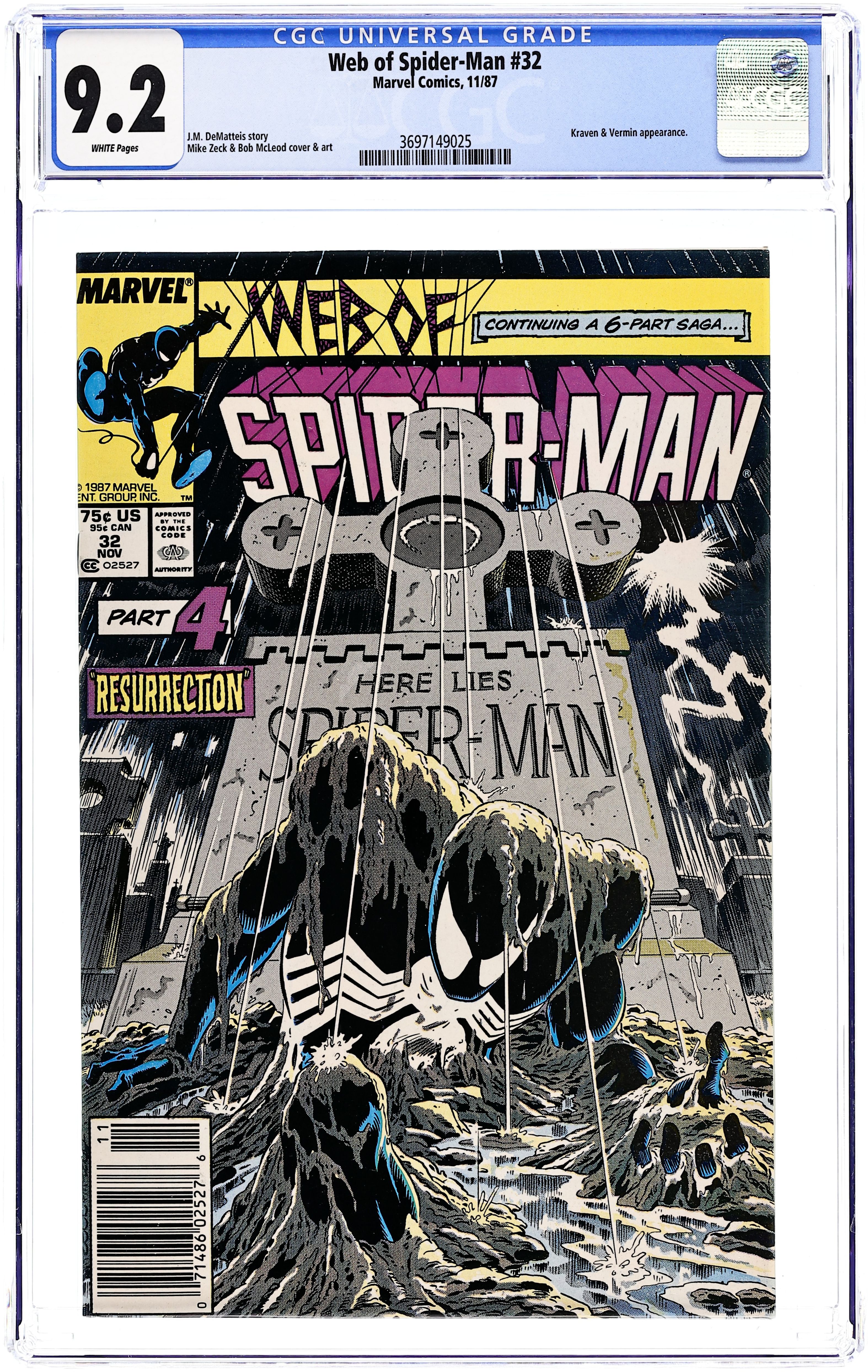 Starts Feb 9 Newsstand Edition. Kraven's Last Hunt - Part 4 of 6 - "Resurrection" Story by J. M. DeMatteis. Art by Mike Zeck and Bob McLeod. Story continues from Spectacular Spiderman 131. Spider-Man finally awakens from his drug-induced coma and busts out of his coffin! Peter quickly returns to his wife, Mary Jane, who has not seen him in two weeks. Meanwhile, Kraven has been committing crimes in New York City, while dressed as Spider-Man. Story continues in Amazing Spiderman 294. Cover price $0.75. Grade: CGC 9.2 explanation of grade Condition: Used (collectible)