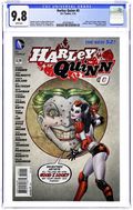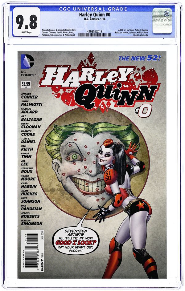 Cover by Amanda Conner. (W) Amanda Conner, Jimmy Palmiotti. (A) Amanda Conner, Becky Cloonan, Tony S. Daniel, Sandu Florea, Stephane Roux, Dan Panosian, Walt Simonson, Jim Lee, Scott Williams, Bruce Timm, Charlie Adlard, Adam Hughes, Art Baltazar, Tradd Moore, Dave Johnson, Jeremy Roberts, Sam Kieth, Darwyn Cooke, Chad Hardin. This bombastic debut issue features art by several award-winning illustrators -- but will any of them measure up to the exacting standards of the Clown Princess of Crime? Don't miss the thrilling return of Harley Quinn in her own monthly series! Cover price $2.99. Grade: CGC 9.8 explanation of grade Condition: Used (collectible)