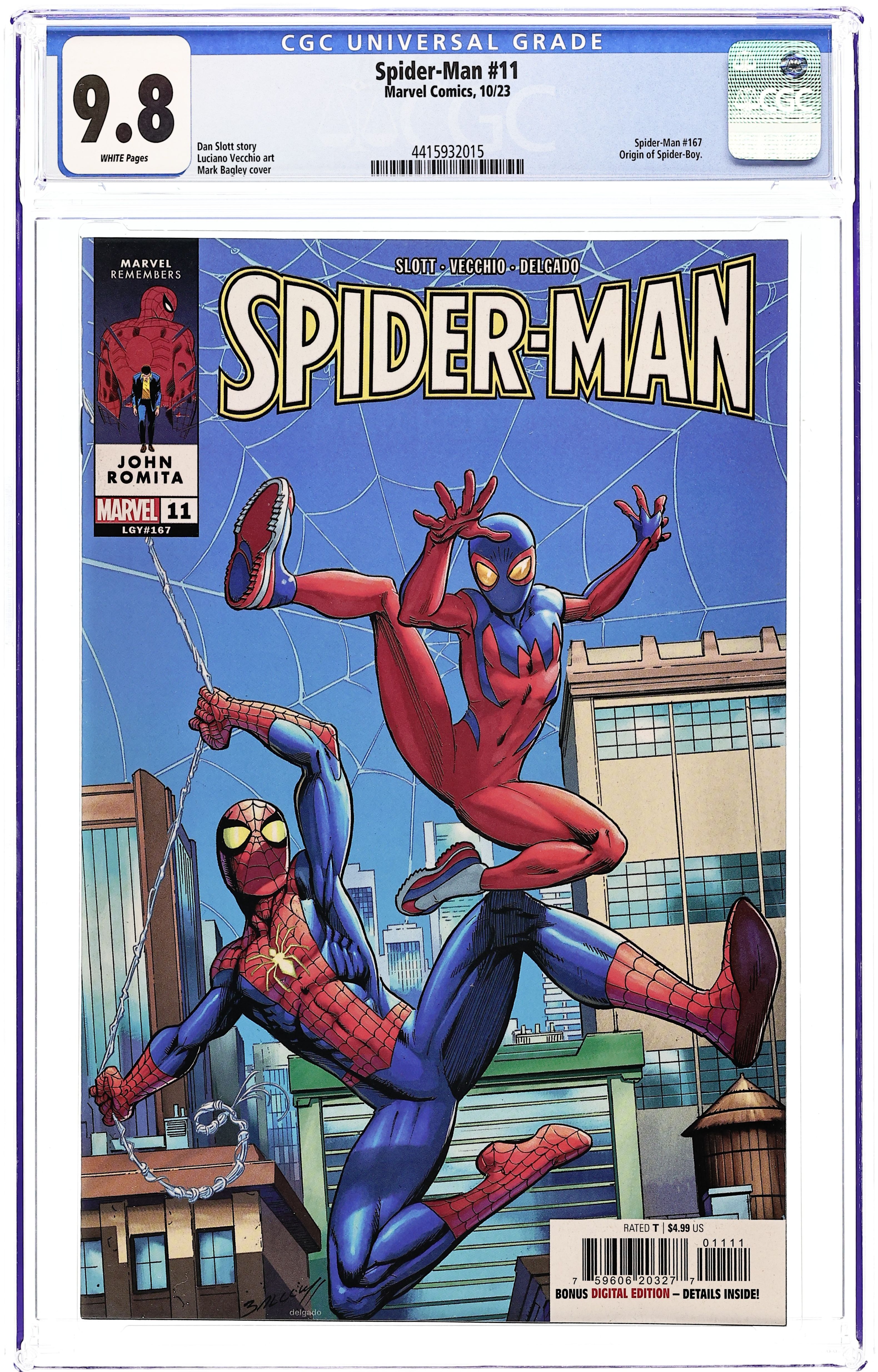 Written by Dan Slott. Art by Luciano Vecchio. Cover by Mark Bagley. (RE)INTRODUCING…SPIDER-BOY! The battle to save the Spider-Verse may be over, but spinning out of the restored Web of Life and Destiny returns the spectacular SPIDER-BOY, Peter Parker's stupendous sidekick! Wait, that can't be right - who IS this Spider-Boy, and what is his connection to the Amazing Spider-Man?! 36 pages, full color. Rated T Cover price $4.99. Grade: CGC 9.8 explanation of grade Condition: Used (collectible)