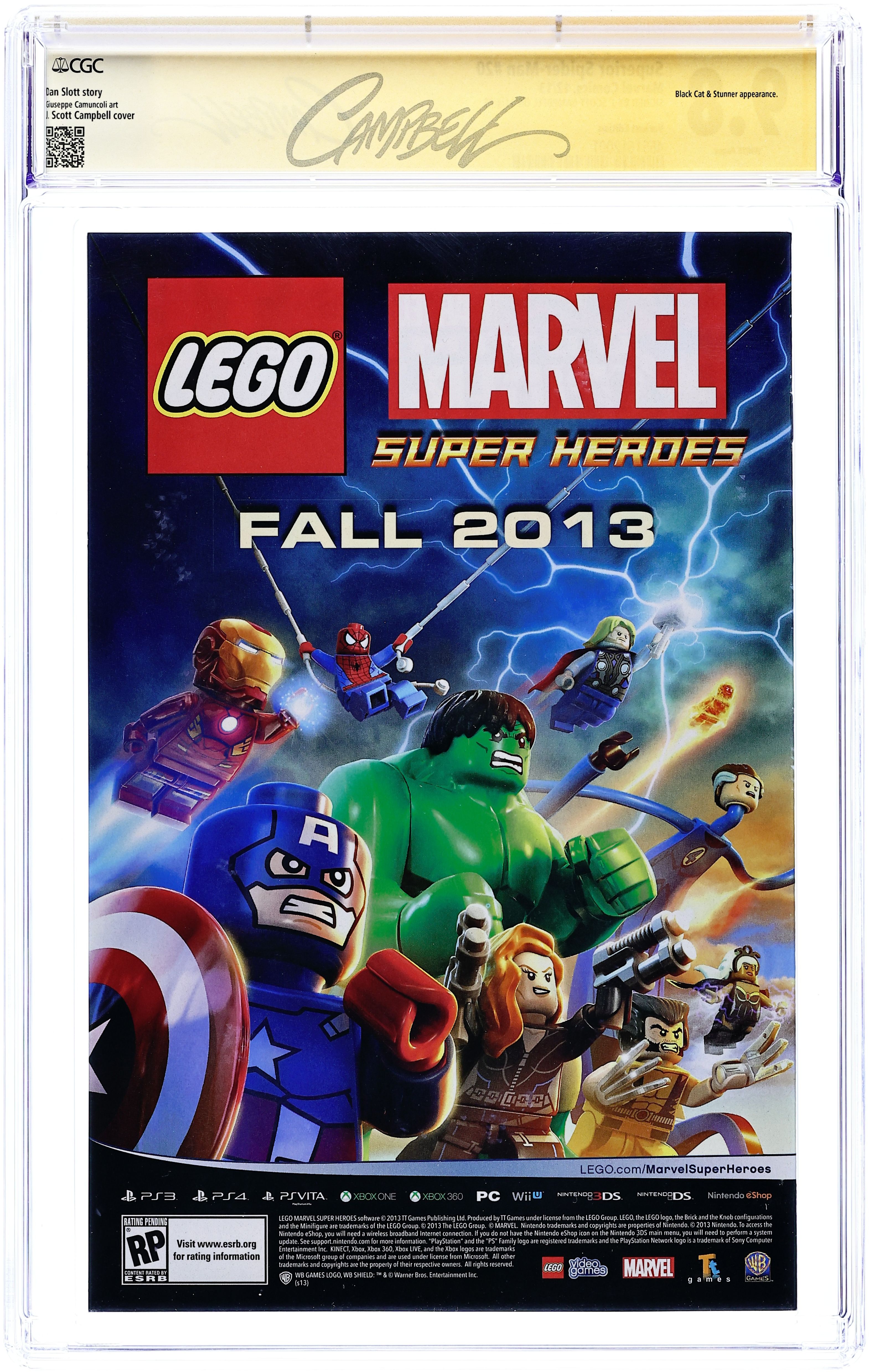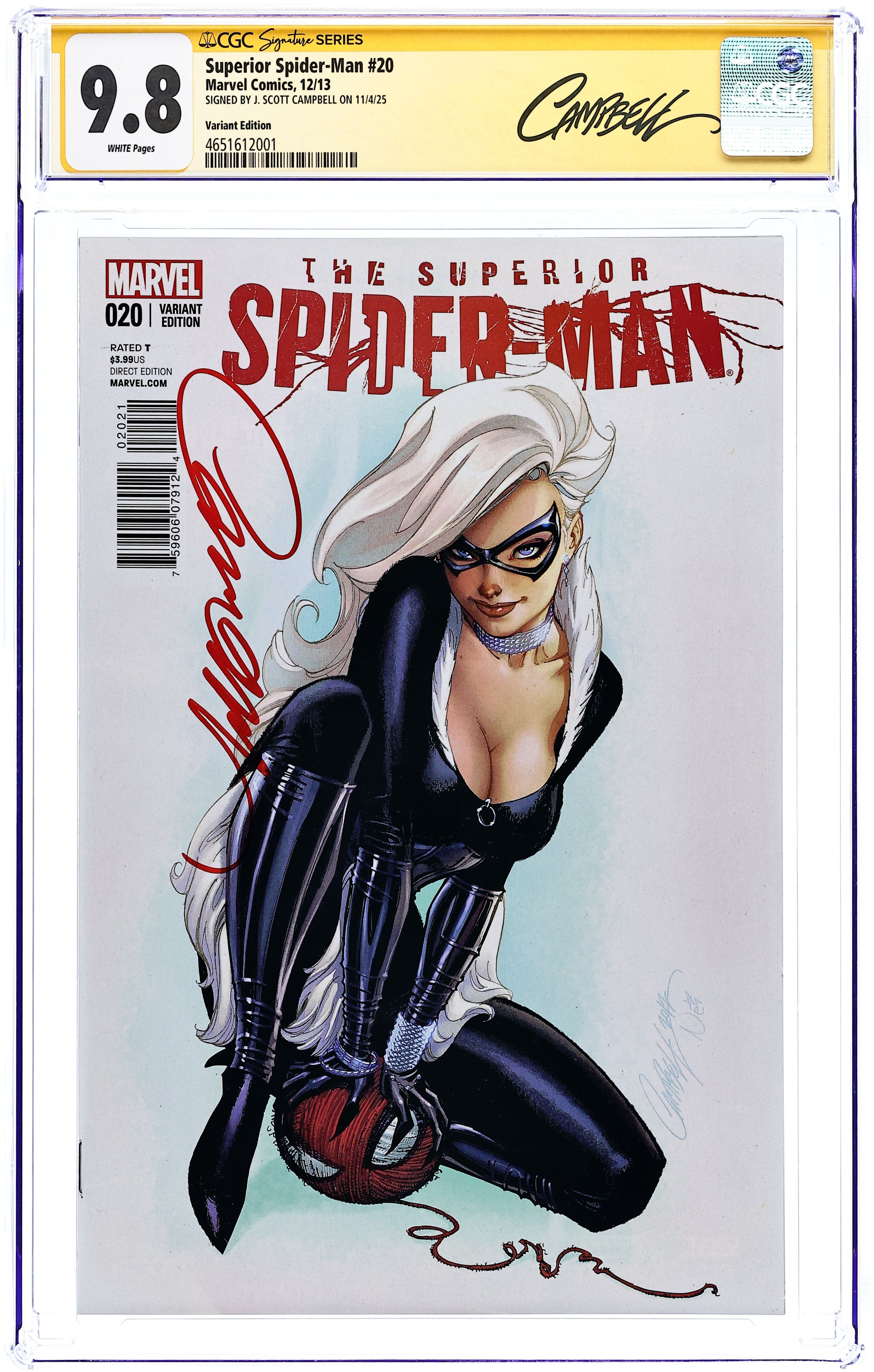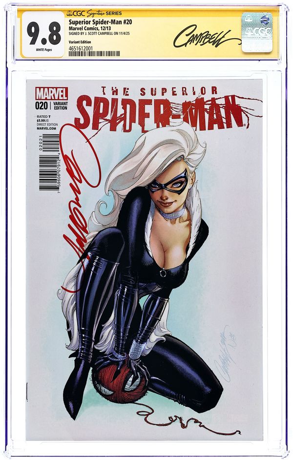 Limited 1 for 50 Variant Cover by J.Scott Campbell. (W) Dan Slott. (A) Giuseppe Camuncoli, John Dell. From the fallout of NECESSARY EVIL, comes new beginnings and new twists that will be felt in the pages of Spider-Man for years to come! SUPERIOR SPIDER-MAN #20 is where it all starts! Do NOT miss this one! It's the first ever adventure for the Superior Spider-Man and the Black Cat. Felicia Hardy always cared for the Spider more than the man. But what happens when that man is Otto Octavius? Plus: A day Otto has been waiting for is finally here. Is the world ready for 'Dr. Peter Parker'... and what he plans to do next? Cover price $3.99. Grade: CGC 9.8 explanation of grade Condition: Used (collectible)