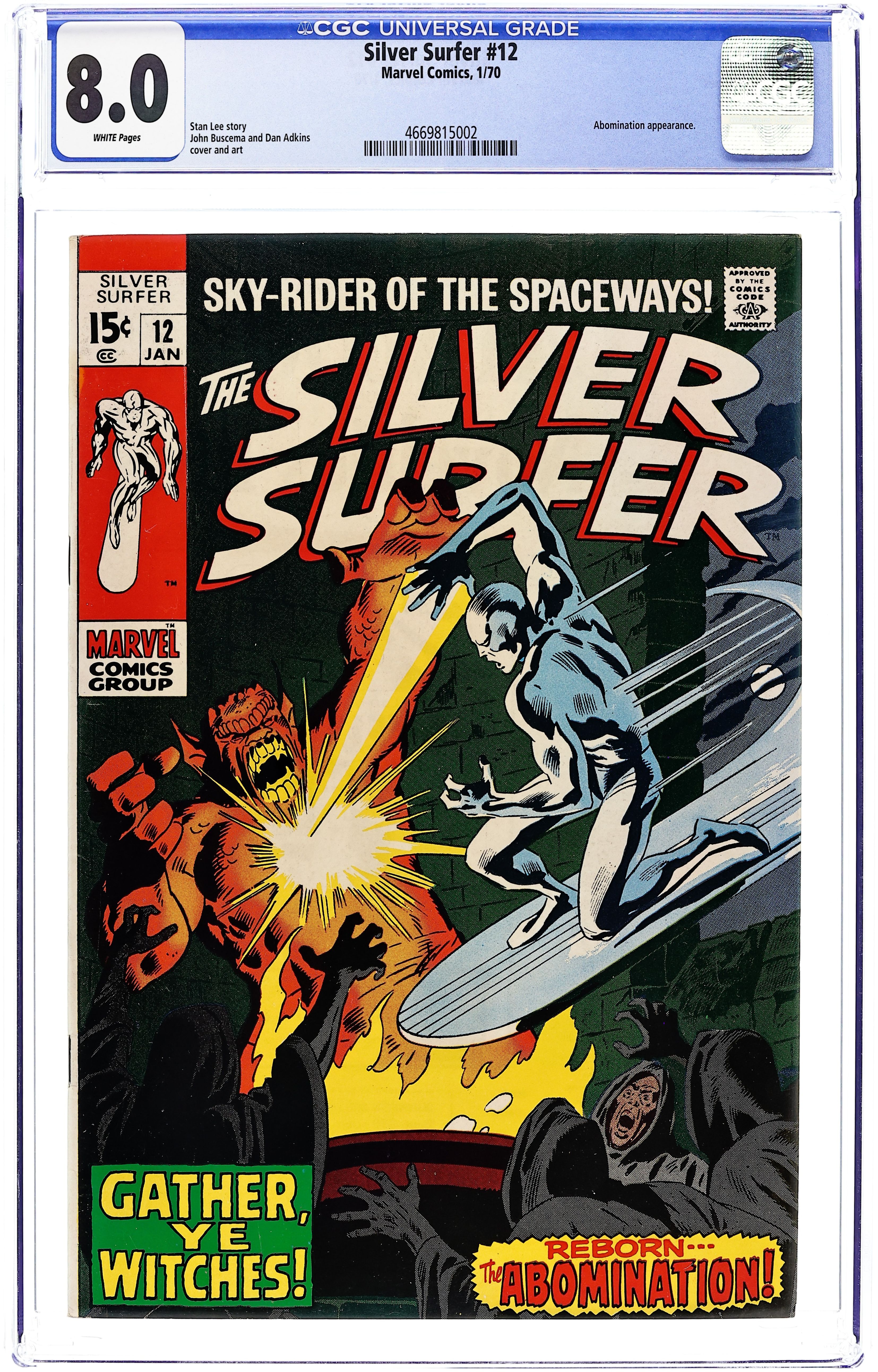 "Gather, Ye Witches!" Written by Stan Lee. Art by John Buscema and Dan Adkins. Can even the Silver Surfer hope to survive an encounter with the awesome might of the Abomination, a creature whose strength rivals that of the Incredible Hulk himself? Cover price $0.15. Grade: CGC 8.0 explanation of grade Condition: Used (collectible)