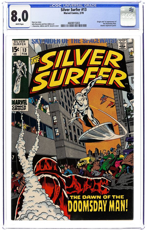 "The Dawn of the Doomsday Man!" Written by Stan Lee. Art by John Buscema and Dan Adkins. The ground rumbles and the citizens of New York City tremble in fear as the monstrosity known as the Doomsday Man rise from the bowels of the earth. Only the Silver Surfer, a being whom the people of Earth have ridiculed and alienated time and again, can save them now. Cover price $0.15. Grade: CGC 8.0 explanation of grade Condition: Used (collectible)