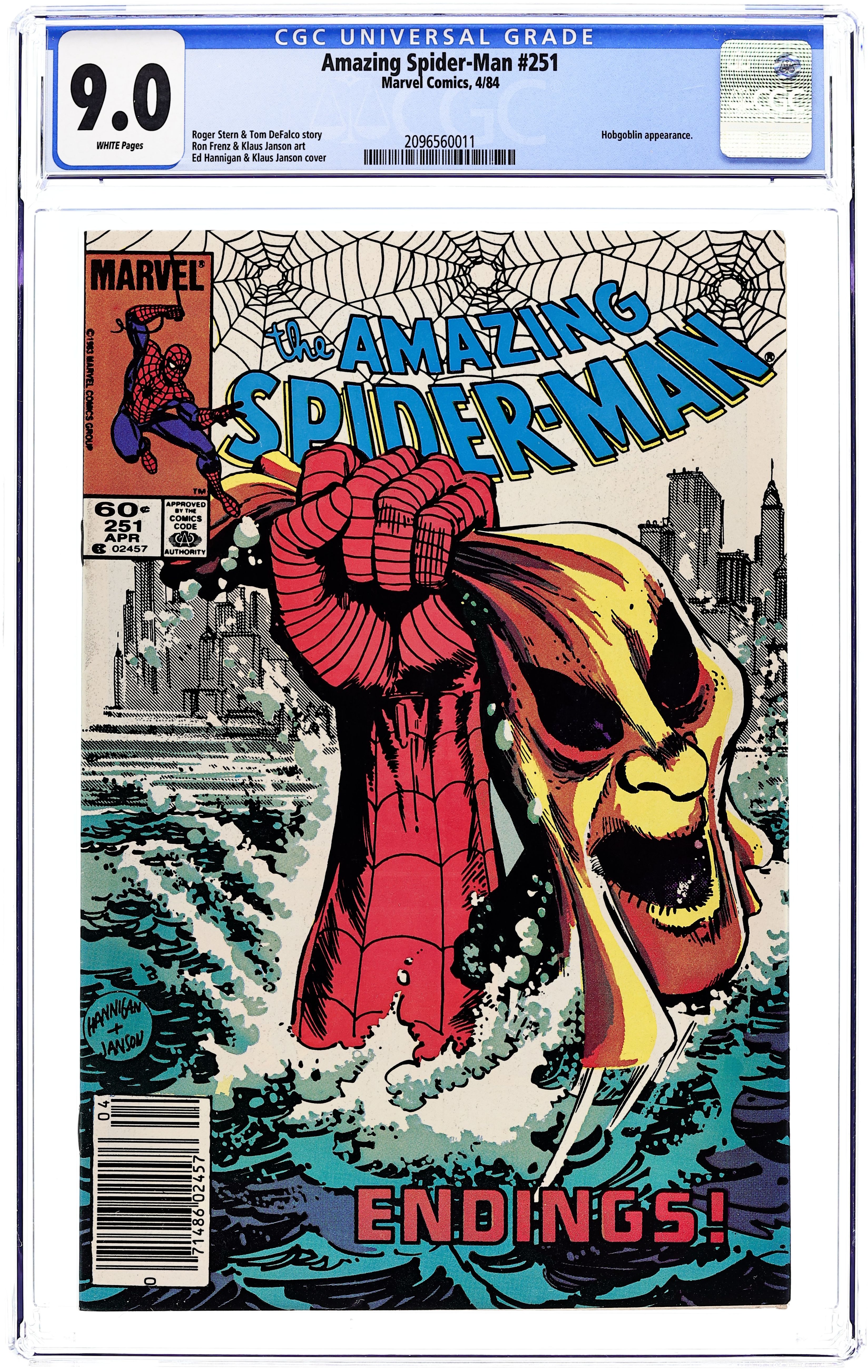 Starts Feb 9 Newsstand Edition. "Endings!" Part 3 of 3. Plot by Roger Stern. Script by Tom DeFalco. Art by Ron Frenz (breakdowns) and Klaus Janson (finishes). Cover by Ed Hannigan and Klaus Janson. After a pumpkin bomb sets his hideout ablaze, the furious Hobgoblin drives away in his battle van! But unbeknownst to the goblin, the web-slinger is holding on for dear life underneath! When Spider-Man crawls inside...the ferocious fight begins! As the Hobgoblin and the wall-crawler trade blows, the battle van careens into the Hudson River! Is the Hobgoblin going to sleep with the fishes? Only time will tell. Several hours later Spider-Man is drawn towards a mammoth citadel in Central Park...and then suddenly disappears! Cameo appearances by Harry Osborn, J. Jonah Jameson and Joe Robertson. (Notes: The Hobgoblin returns briefly in Amazing Spiderman 255. Tom DeFalco begins his 3-year run as the writer of the Amazing Spider-Man title. Likewise, Ron Frenz begins his 3-year run as the primary penciler. This issue includes a full-page ad for the first Marvel Super Heroes Secret Wars Limited Series (where the web-slinger appears next). This three-part story was reprinted in Marvel Tales 259, 260, and 261.) 36 pgs. Cover price $0.60. Grade: CGC 9.0 explanation of grade Condition: Used (collectible)