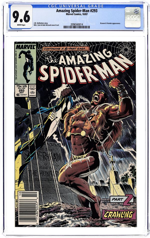 Starts Feb 9 Newsstand Edition. Kraven's Last Hunt: Part 2 of 6 -- "Crawling" Script by J.M. DeMatteis. Pencils by Mike Zeck. Inks by Bob McLeod. Cover by Mike Zeck and Bob McLeod. Story continues from Web of Spider-Man 31. In a shocking development, Kraven the Hunter has buried the Amazing Spider-Man six feet under! And now the deranged hunter is wearing his own spider costume and fighting crime on the streets of New York City! Unbelievable! What in the world is going on?! That's what Mary Jane would like to know as she desperately searches for her newlywed husband! And to make matters worse, there's something horrific coming up from the sewers: Vermin! Story continues in Spectacular Spider-Man 131. (Note: Vermin previously appeared in Marvel Team-Up 128.) 36 pages. Cover price $0.75. Grade: CGC 9.6 explanation of grade Condition: Used (collectible)