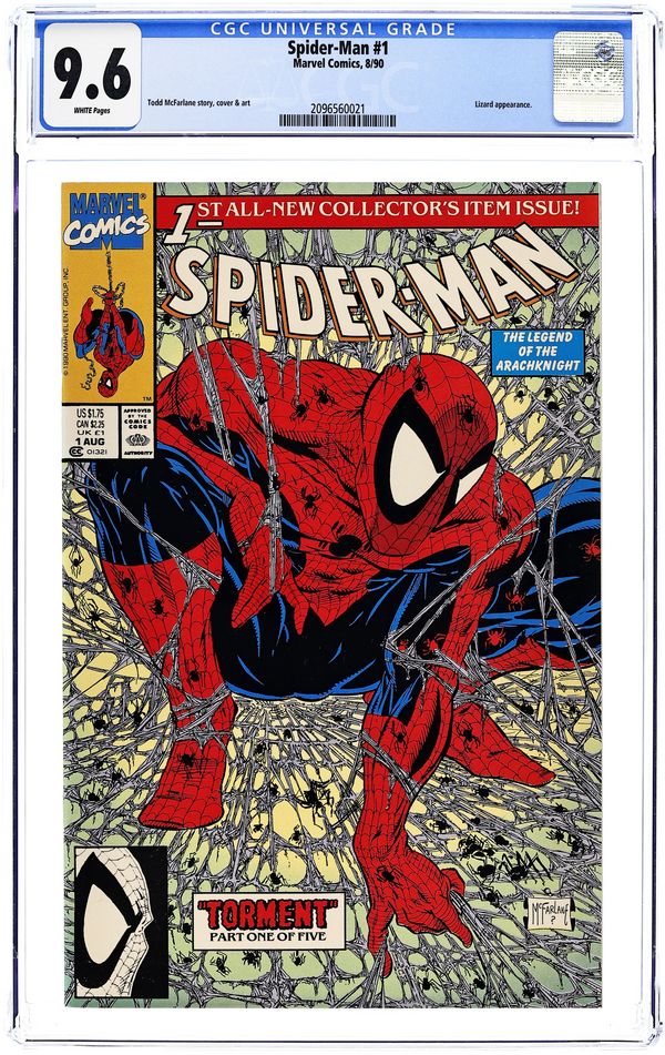 Starts Feb 9 Unbagged Direct Edition - Torment Part 1 of 5. "Torment" Script and art by Todd McFarlane. Cover by Todd McFarlane. Fresh off his legendary run on the Amazing Spider-Man series, superstar artist Todd McFarlane takes the reins of his own Spider-title! Right off the bat the breathtaking action begins as mysterious and ominous drums awaken the Lethal Lizard! And send the reptilian creature on a path of death and destruction thru New York City! Spider-Man's nightmare is just starting! Appearance by Mary Jane Watson. (Notes: Spider-Man #1 was one of the first Marvel issues to feature numerous variant covers. The Spider-Man (1990) series became the fourth monthly title for the web-slinger. This issue was published the same month as Amazing Spider-Man 337. The letters page features an essay by Todd McFarlane. The webbing on the cover may be gray or purple.) 32 pages. Cover price $1.75. Grade: CGC 9.6 explanation of grade Condition: Used (collectible)