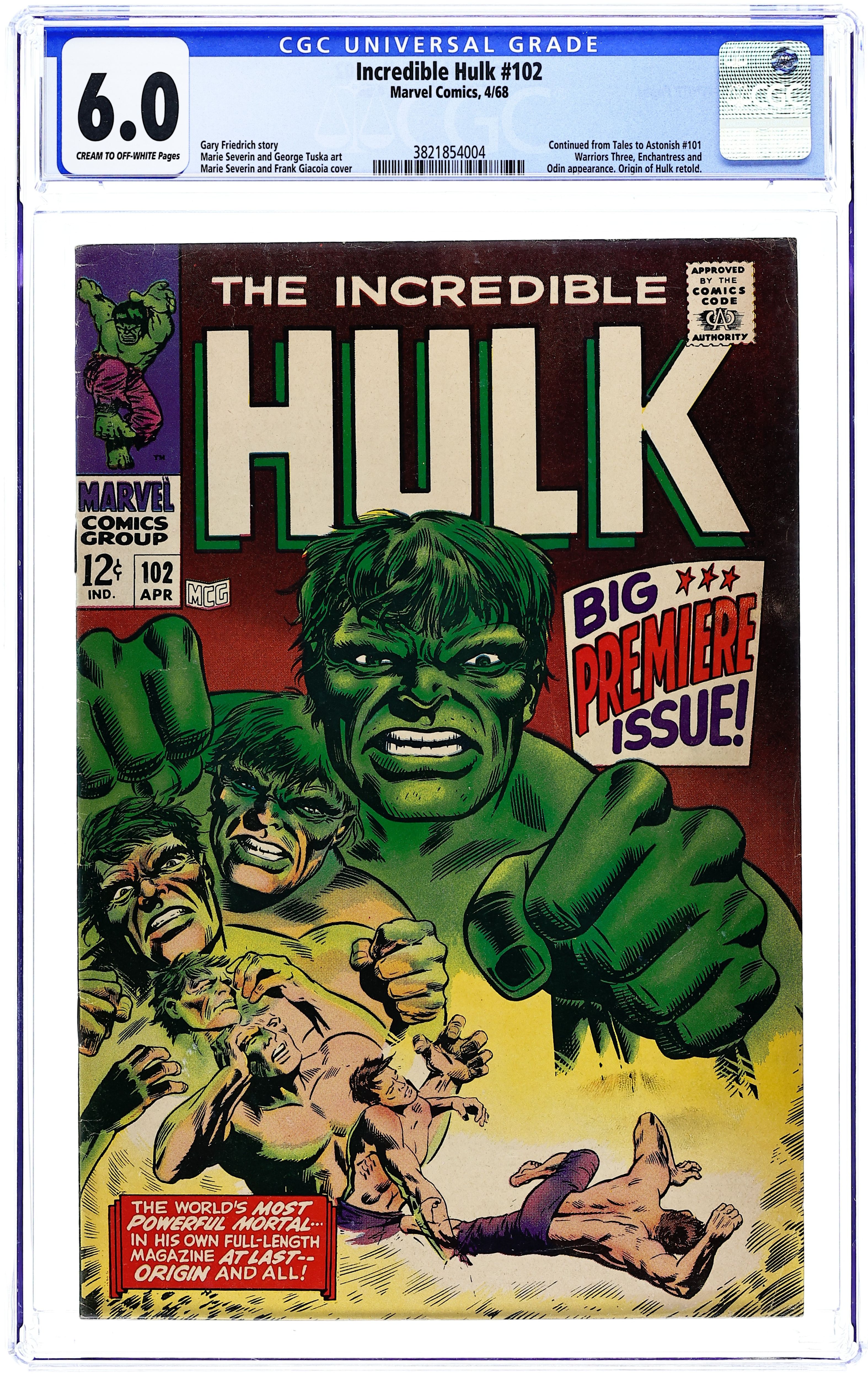 Formerly Tales to Astonish. Cover pencils by Marie Severin, inks by Frank Giacoia. This World Not His Own!, script by Gary Friedrich, pencils by Marie Severin, inks by George Tuska and Syd Shores; Bruce Banner is falling down a bottomless pit back to Midgard when the Enchantress plucks him back to Asgard out of curiosity; The Warriors Three consult Oldar the Oracle and find out the origins of the Hulk; Captured by Enchantress and Executioner, Banner transforms into the Hulk which enrages the Executioner who has fought the jade giant before (back in TTA #77); Leaving the Hulk behind, the evil duo lead an army of trolls against Asgard and the Hulk arrives on the scene just in time to lend a hand in the victory of Odin's forces. House ad for Not Brand Echh #7 and Daredevil #38. 36 pgs. This issue picks up after the events of Tales to Astonish (1959-1968 1st Series) #101. Cover price $0.12. Grade: CGC 6.0 explanation of grade Condition: Used (collectible)