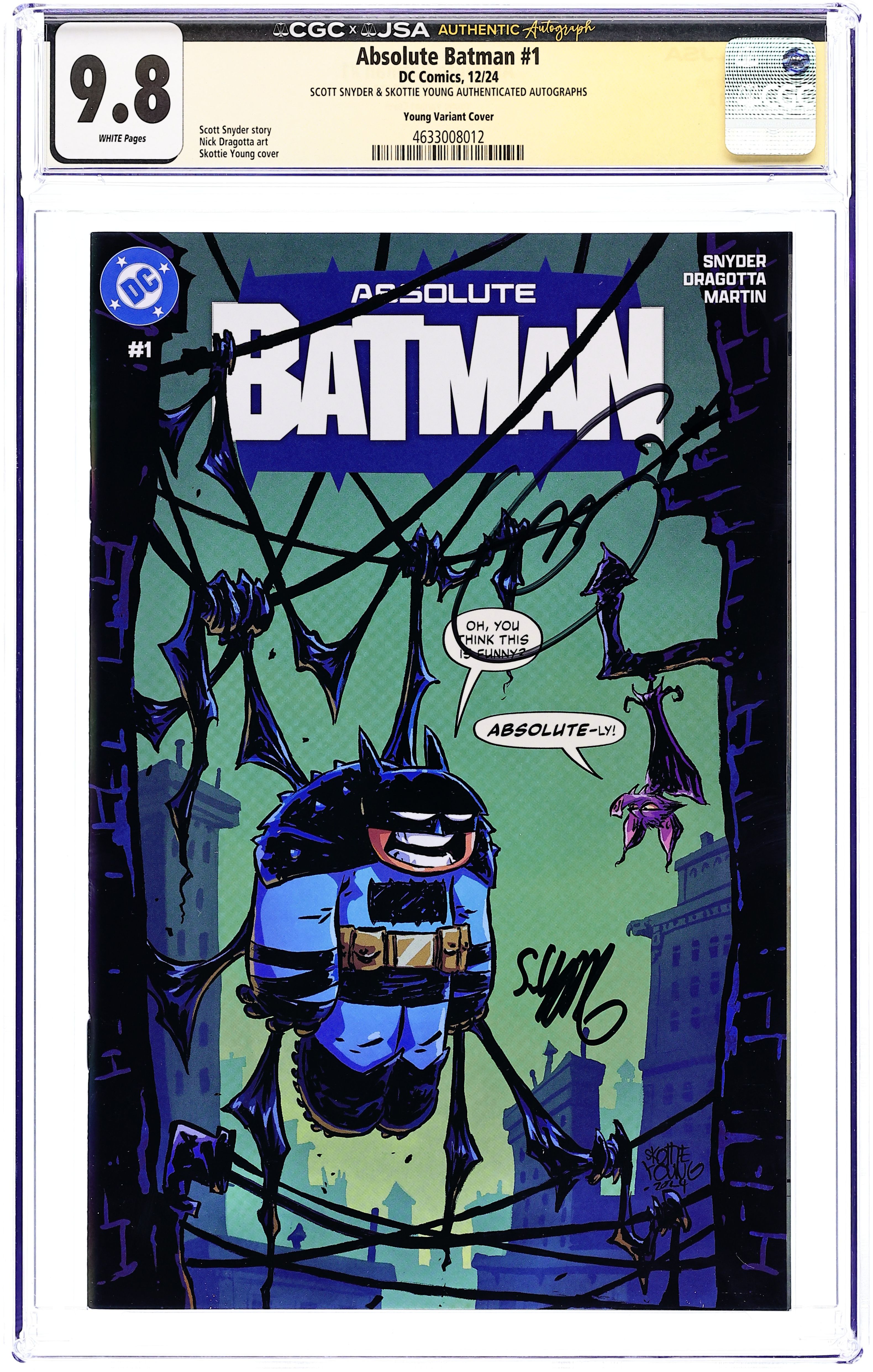 Webstore Exclusive Variant Cover by Skottie Young. Written by Scott Snyder. Art by Nick Dragotta. BATMAN LEGEND SCOTT SNYDER AND ICONIC ARTIST NICK DRAGOTTA TRANSFORM THE DARK KNIGHT'S TALE FOR THE MODERN AGE! Without the mansion...without the money...without the butler...what's left is the Absolute Dark Knight! 44 pages, full color. Rated T+ Grade: CGC 9.8 explanation of grade Condition: Used (collectible)