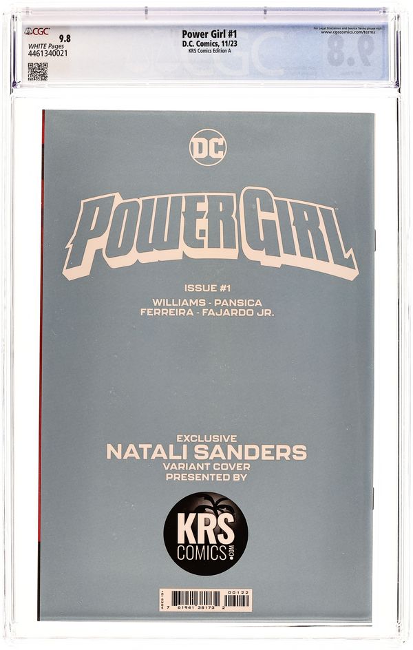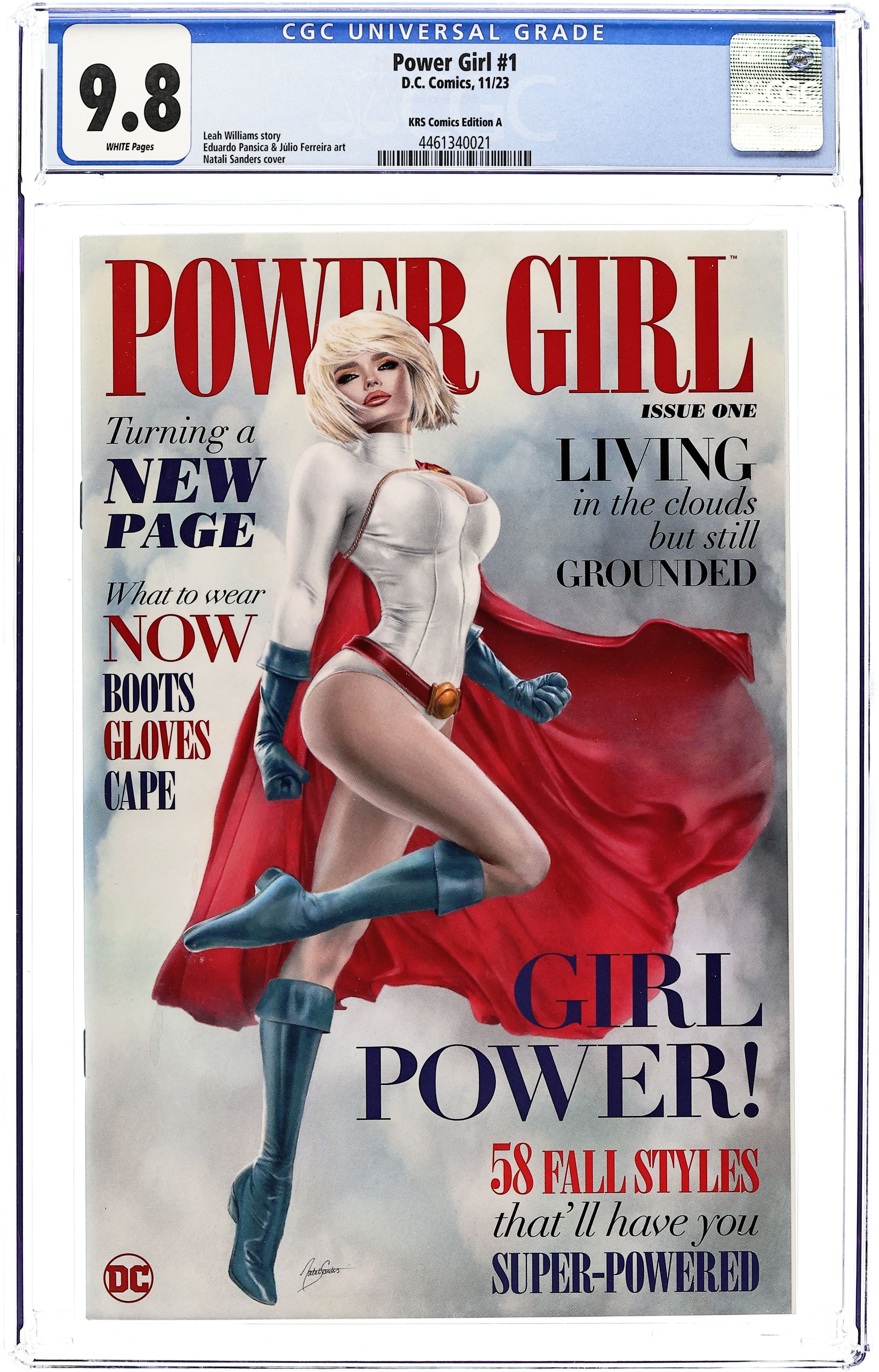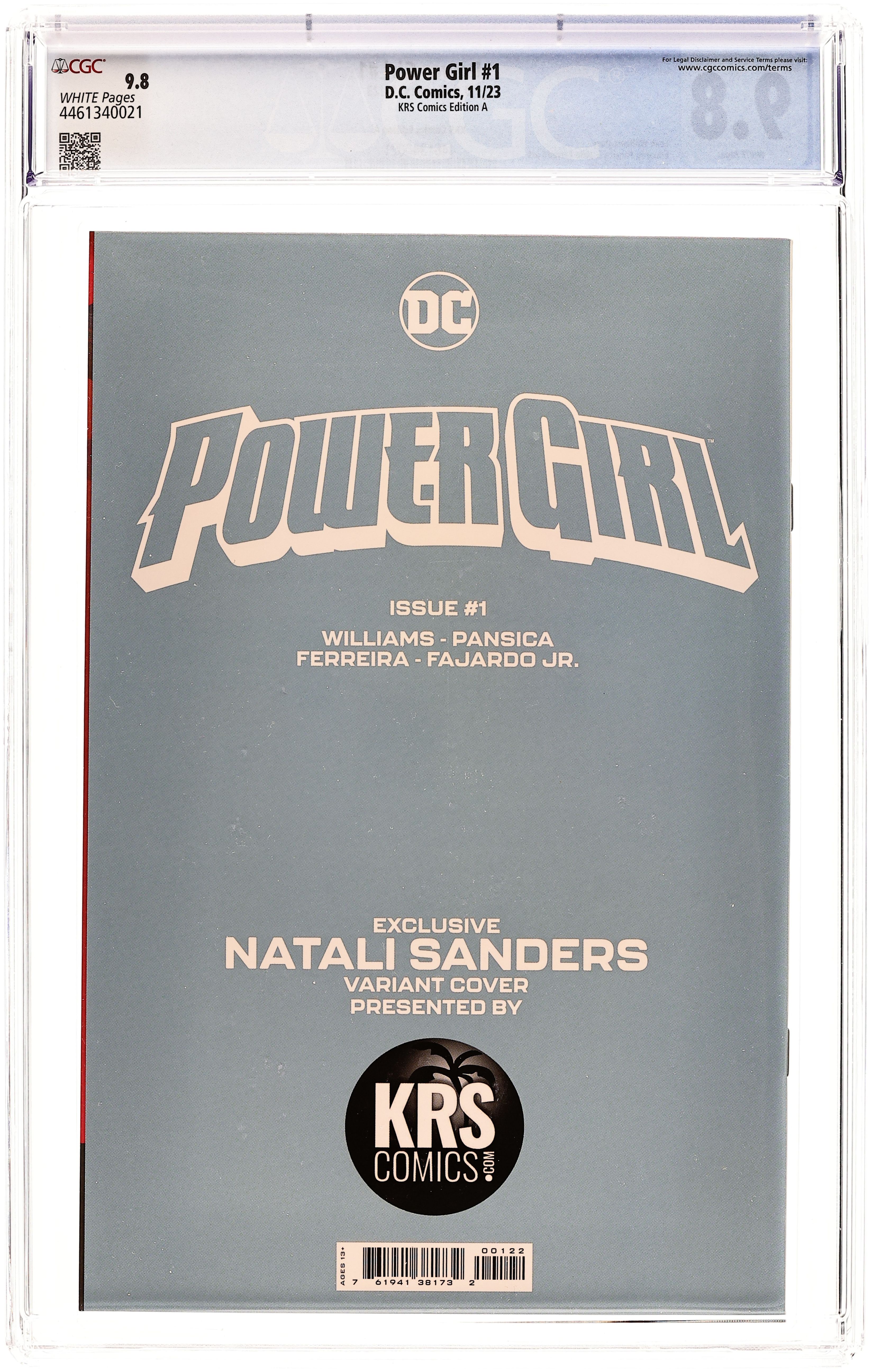 KRS Comics Exclusive Cover by Natali Sanders. Written by Leah Williams. Art by Eduardo Pansica, Julio Ferreira. PRETTY, PUNCHY, AND POWERFUL! After the events of Knight Terrors, a long-dormant Kryptonian threat has returned to take down Superman and his family. Who could possibly stop it? Well, according to the Man of Steel, its Power Girl! Witness a road trip race against time as Paige reconnects with her roots to save the world from her deadly past. Power Girl Special writer Leah Williams returns with artist Eduardo Pansica (Supergirl) for an ongoing series of epic proportions! 32 pages, full color. Rated T+ Grade: CGC 9.8 explanation of grade Condition: Used (collectible)