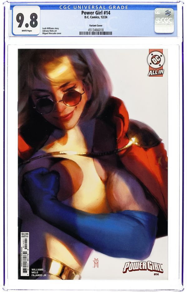 Written by Leah Williams. Art by Adriana Melo. Cover by Miguel Mercado. ENTER EJECTA! The mysterious new hero has taken Metropolis by storm, but Power Girl and Omen don't believe the hype. How can this heroine stop crime before it starts? Find out as Power Girl fights to save her city from itself! 32 pages, full color. Rated T+ Cover price $4.99. Grade: CGC 9.8 explanation of grade Condition: Used (collectible)