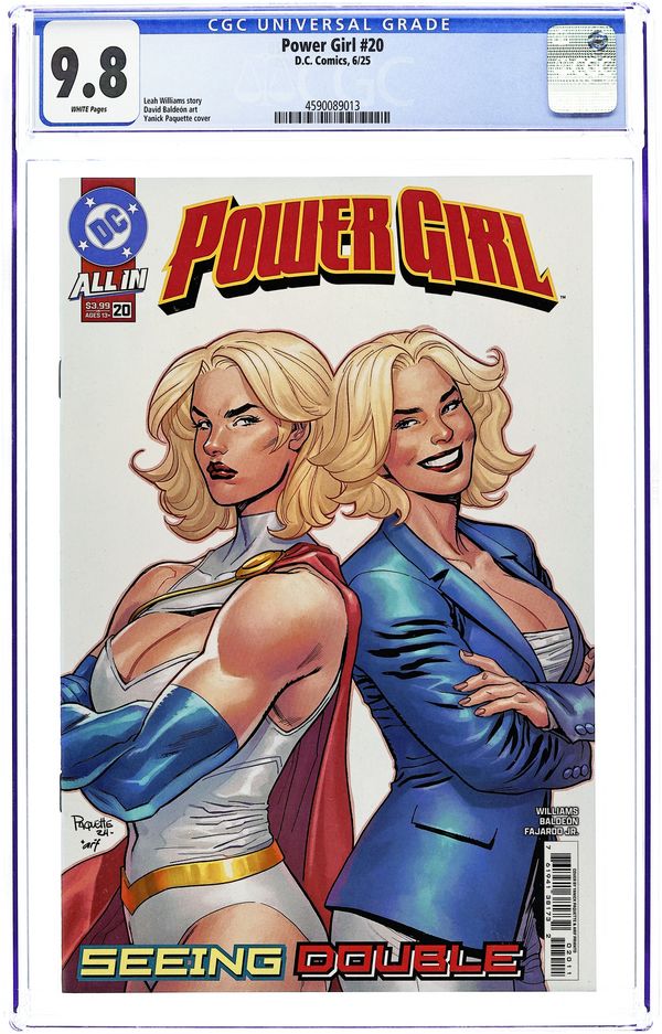 Written by Leah Williams. Art by David Baldeon. Cover by Yanick Paquette. Karen Starr has triumphantly returned to Metropolis. But there's a problem...the person using that alias isn't Power Girl! Paige can't just stand by as this new Karen gets involved in ventures and schemes she would never dream of. It's up to her to expose this imposter before they ruin her reputation for good! 28 pages, full color. Rated T+ Cover price $3.99. Grade: CGC 9.8 explanation of grade Condition: Used (collectible) unless item is a new release
