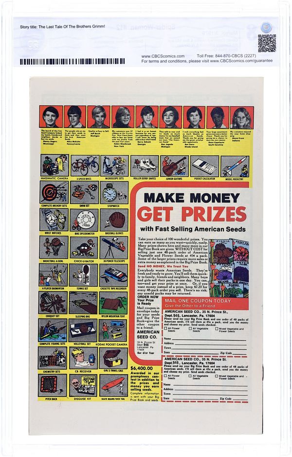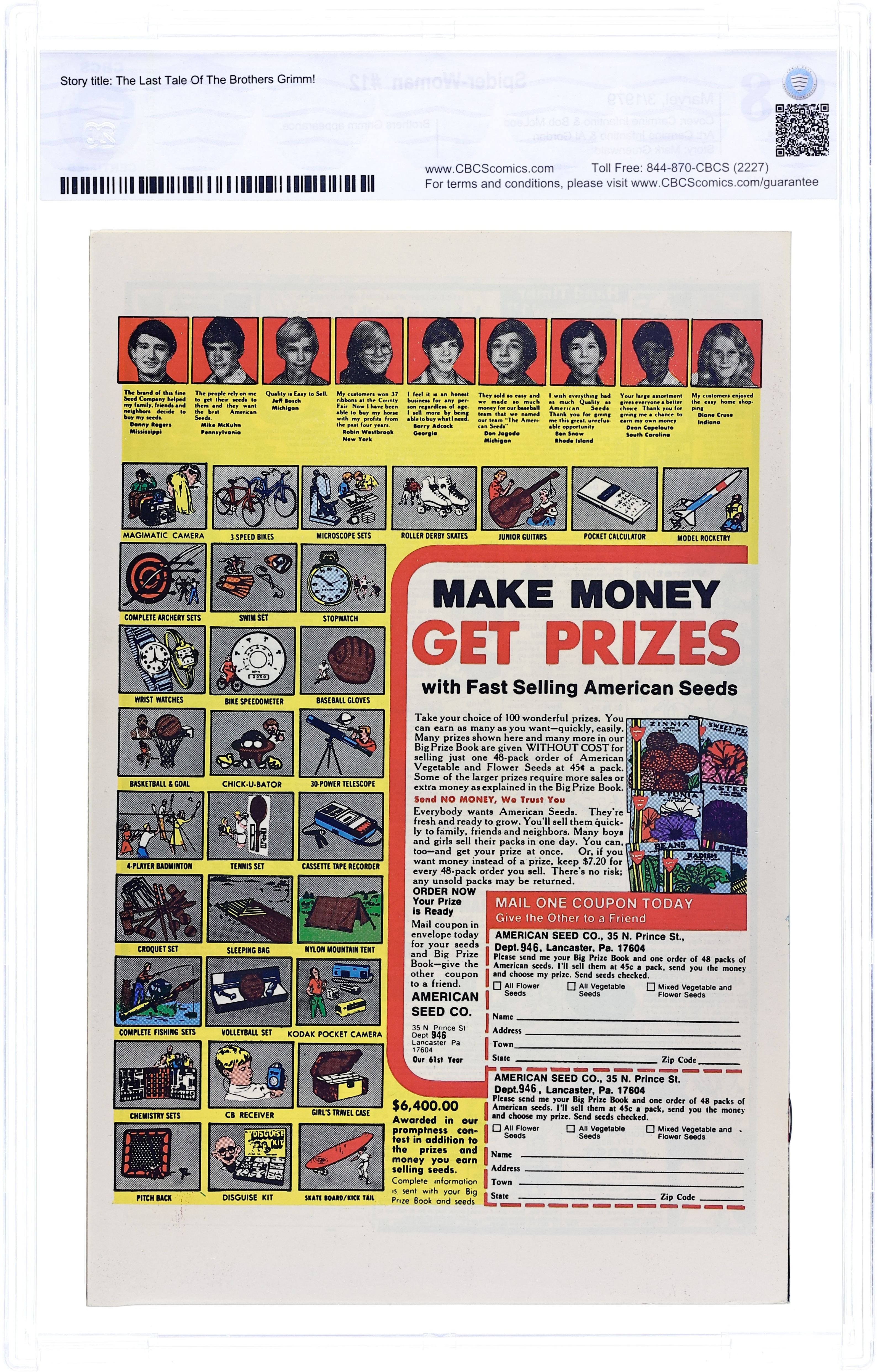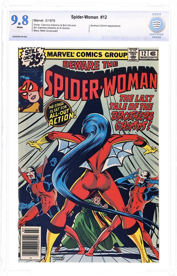Cover pencils by Carmine Infantino, inks by Bob McLeod. The Last Tale of the Brothers Grimm! starring Spider-Woman, script by Mark Gruenwald, pencils by Carmine Infantino, inks by Al Gordon; Madame Doll tries to revive her husband. 32 pgs. $0.35. Cover price $0.35. Grade: CBCS 9.8 explanation of grade Condition: Used (collectible)