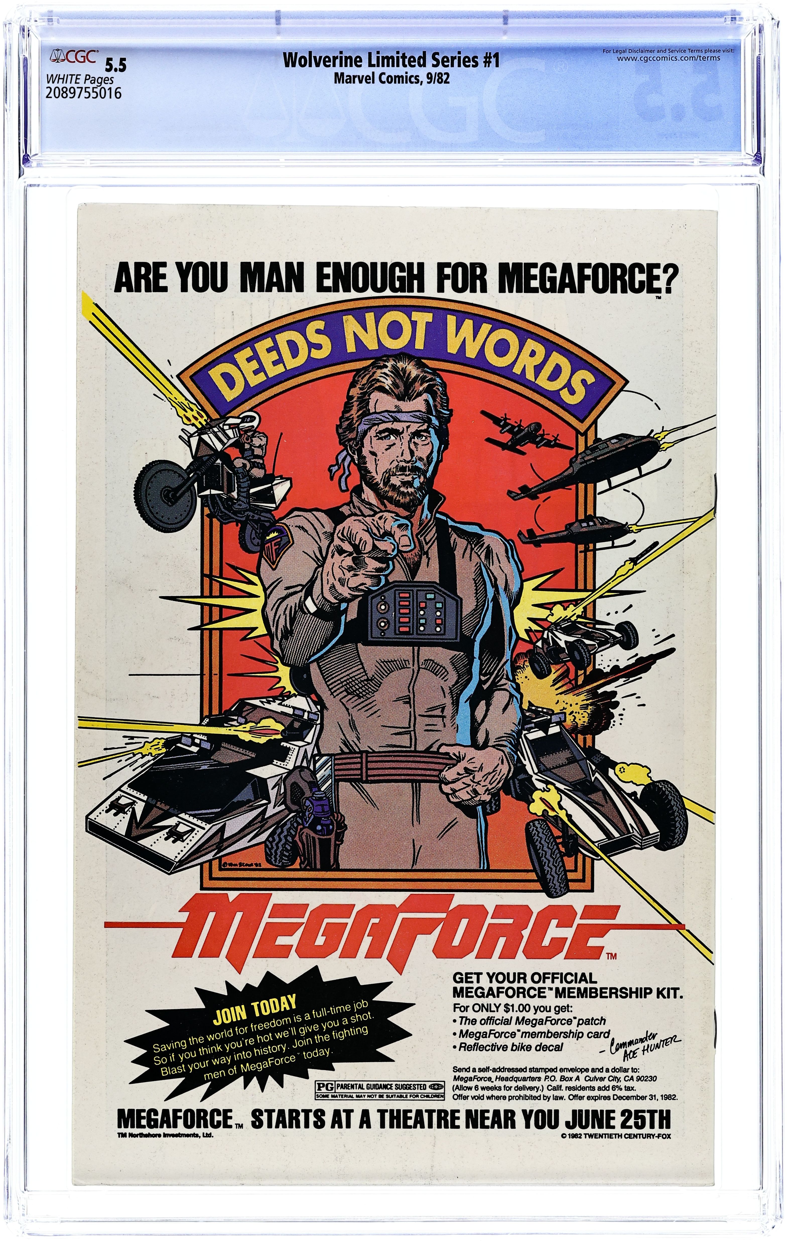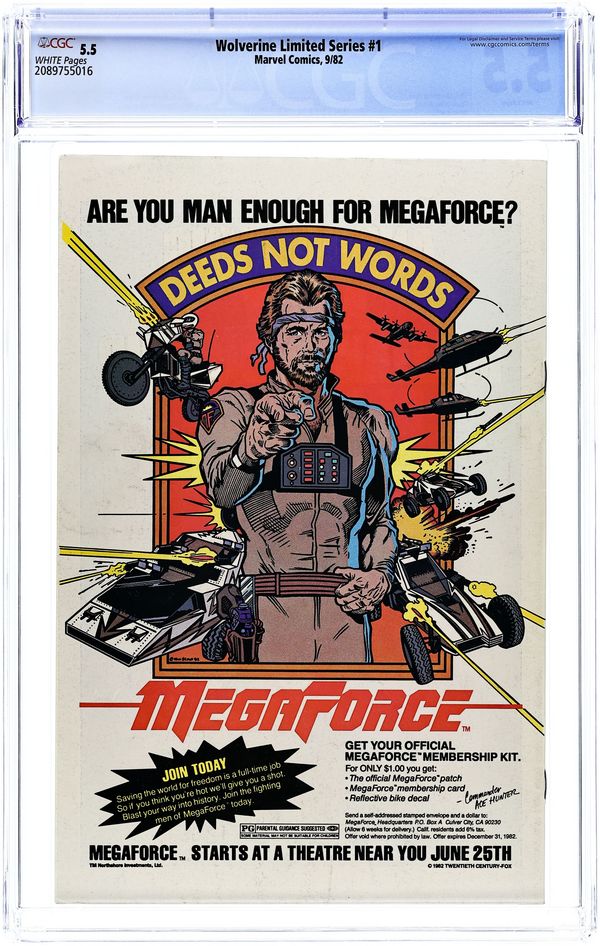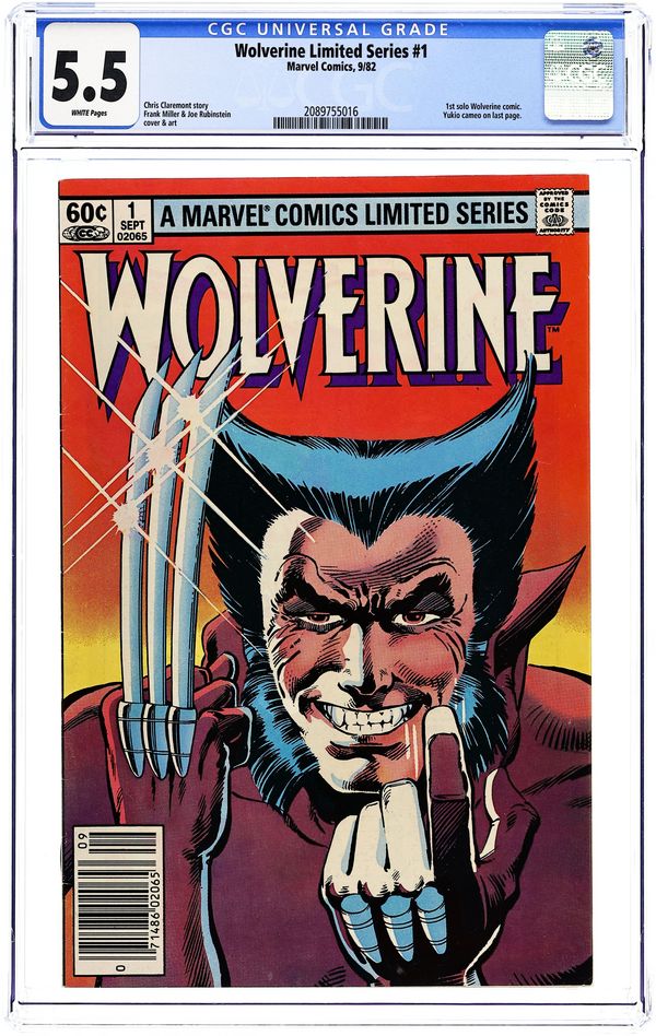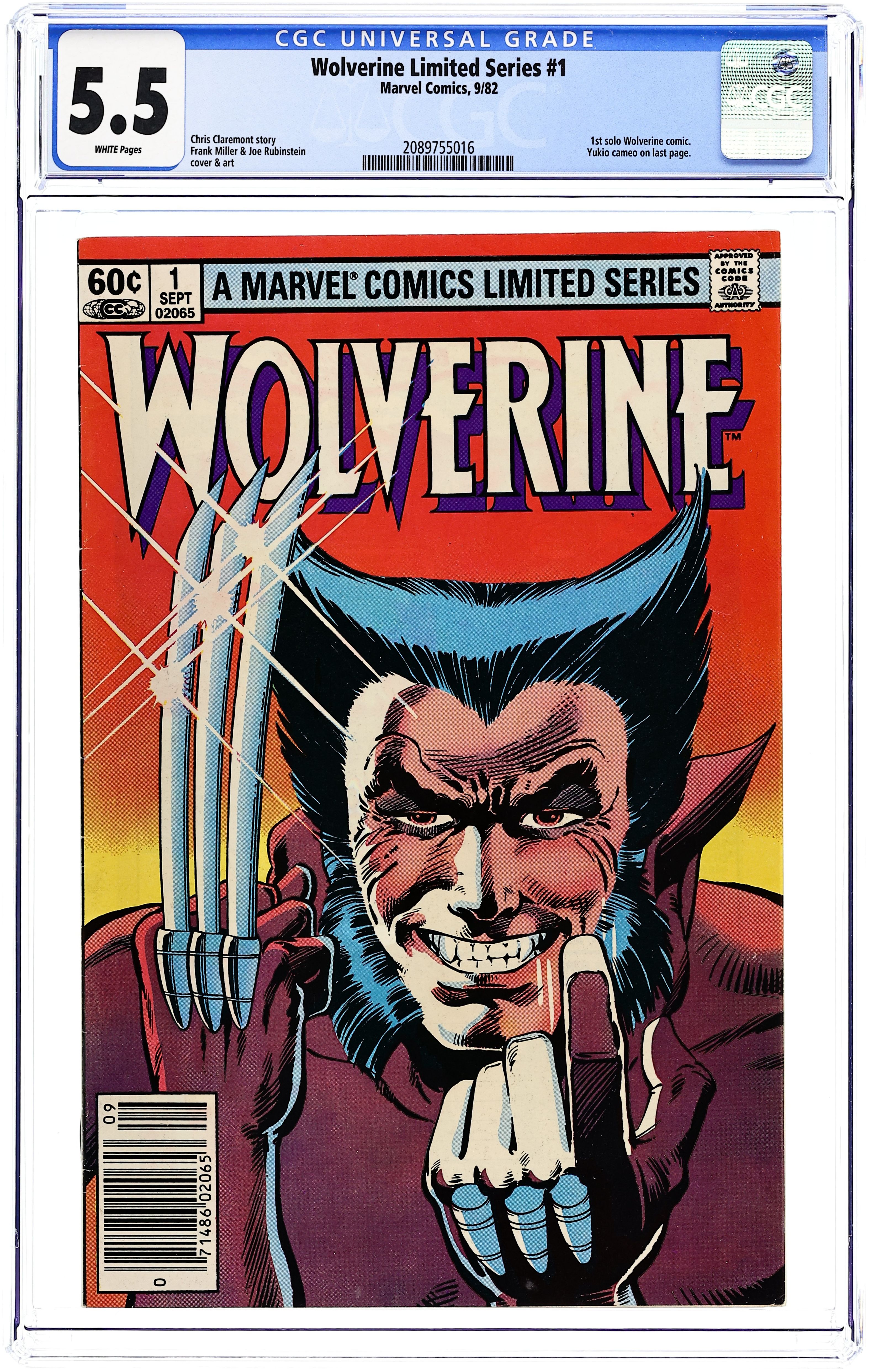 Starts Feb 9 Newsstand Edition. 1 of 4 Featuring Wolverine in his first solo series fighting in Japan. "Wolverine." Script by Chris Claremont, pencils by Frank Miller, inks by Joe Rubinstein. Miller/Rubinstein cover. Back cover MegaForce ad with art by William Stout. Cover price $0.60. Grade: CGC 5.5 explanation of grade Condition: Used (collectible)