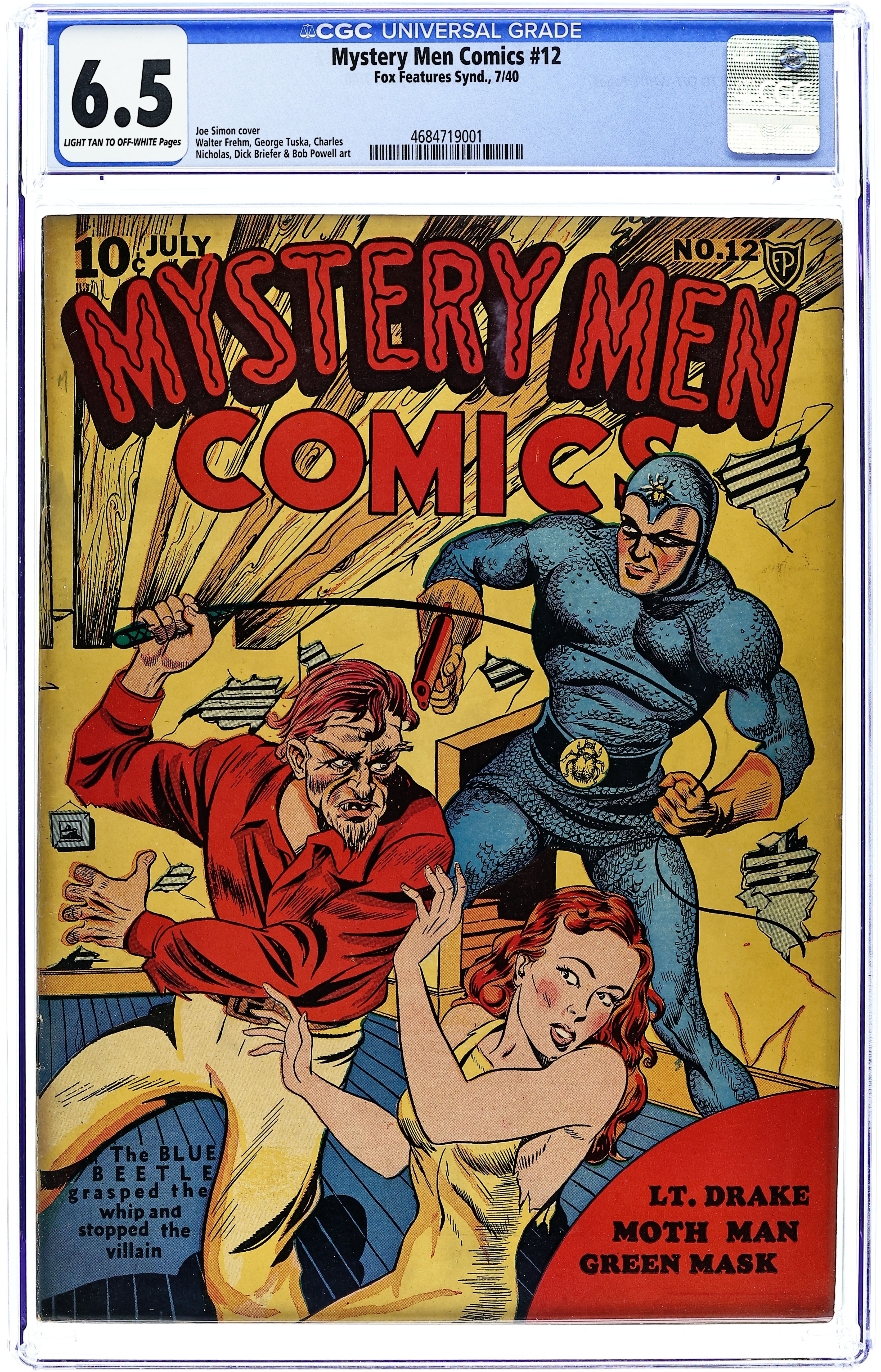 Cover art by Joe Simon. "Bomb Kills Hundreds in Midtown," art by Charles Nicholas; The Blue Beetle vs. The Sylvanian Consul Secretary; Beetle defeats 20 mobsters in one fistfight. Untitled story, art by George Tuska; Wing Turner battles Nazis. Untitled story, script and art by Dick Briefer; Rex Dexter vs. The Hunter. Untitled story, art by Walter Frehm; The Green Mask deals with a Federal Reserve robbery. "Demons of Doom" starring Chen Chang, art by Munson Paddock (as Cecilia Munson). "Twentieth Century Death Ray" text story by B. A. Martin. Untitled story, script and art by Klaus Nordling (as F. Klaus); Lt. Drake is assigned the task of capturing the men responsible for smuggling orientals into the United States. "The Strange Case of the Terror Castle Grave Robberies," art by Jim Mooney; The Doc sends some of his hoodlums into a cemetery looking for a disease-free body into which he plans to transplant a brain, thus allowing him to have the power of God to create life. Untitled Hemlock Shomes by Fred Schwab. Untitled D-13 story, script and art by Bob Powell; An attack in the South Atlantic; vs. Nazis. Untitled story, art by George Tuska; Zanzibar vs. The Zombie Master. 68 pgs., full color. Cover price $0.10. Grade: CGC 6.5 explanation of grade Condition: Used (collectible)