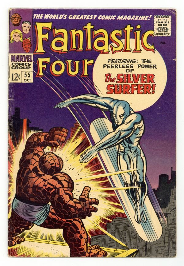 Cover pencils by Jack Kirby, inks by Joe Sinnott. Fourth appearance of the Silver Surfer in "When Strikes the Silver Surfer!", script by Stan Lee, pencils by Jack Kirby, inks by Joe Sinnott; Filled with jealousy, Ben attacks the Silver Surfer. Lockjaw (of the Inhumans) appearance. 36 pgs. $0.12. Cover price $0.12. Grade: GD 2.0 explanation of grade Condition: Used (collectible)