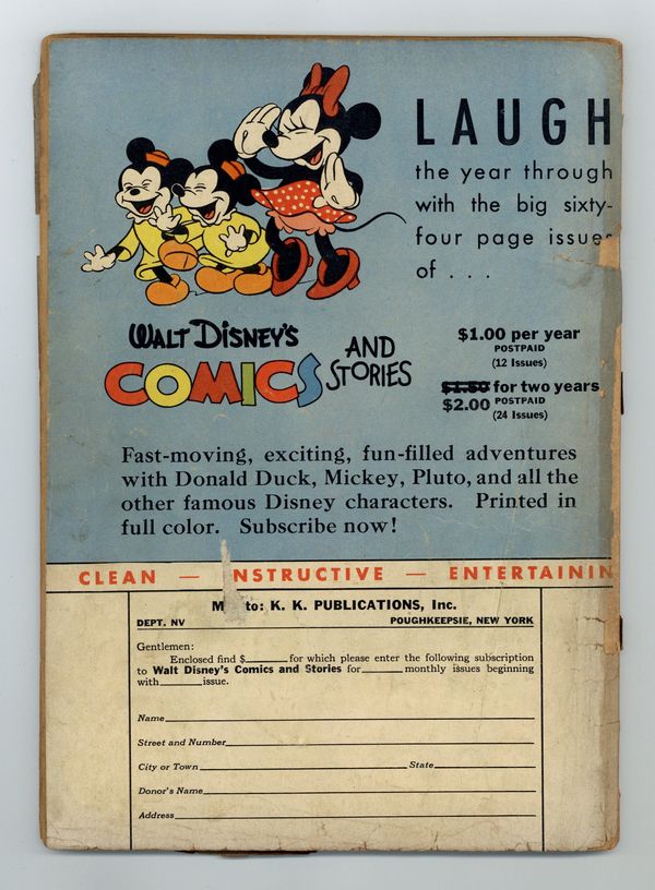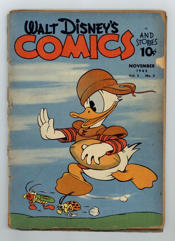 Cover by Carl Buettner. Stories and art by Floyd Gottfredson, Ted Osborne, Ted Thwaites, Merrill De Maris, Bob Karp, Manuel Gonzales, Bob Wright, Bob Grant, and Al Taliaferro. Sometimes listed as Vol. 3 #2. The long-running vehicle for Disney character comics. In a classic Floyd Gottfredson story from the Mickey Mouse comic strip, Mickey discovers that a mysterious force field prevents planes from flying over a hidden valley. Bucky Bug sails into Mother Goose Land and encounters characters from nursery rhymes. In one of several stories reflecting America's entry into WWII, Donald Duck can't listen to the radio because of air-defense broadcasts. A Bedtime Story; Bringing Home the Bacon; Dead End Kidder; The Heat's on; Donald's Tire Troubles; A Horse of a Different Color; Expensive Economy; Dead Letter Office; Poor Reception; The Vanishing Magician; Mickey Mouse at the Bar None Ranch; Hollywood Chatter; Farmers' Problems; Foiled Again!; Great Expectations; No Half-Way Measures; Overloaded; How to Be a Sailor; Mickey Mouse Movies; Boys Will Be - Girls!; The Wrong Combination. 64 pages, Full Color. Cover price $0.10. Grade: FR 1.0 explanation of grade Condition: Used (collectible)