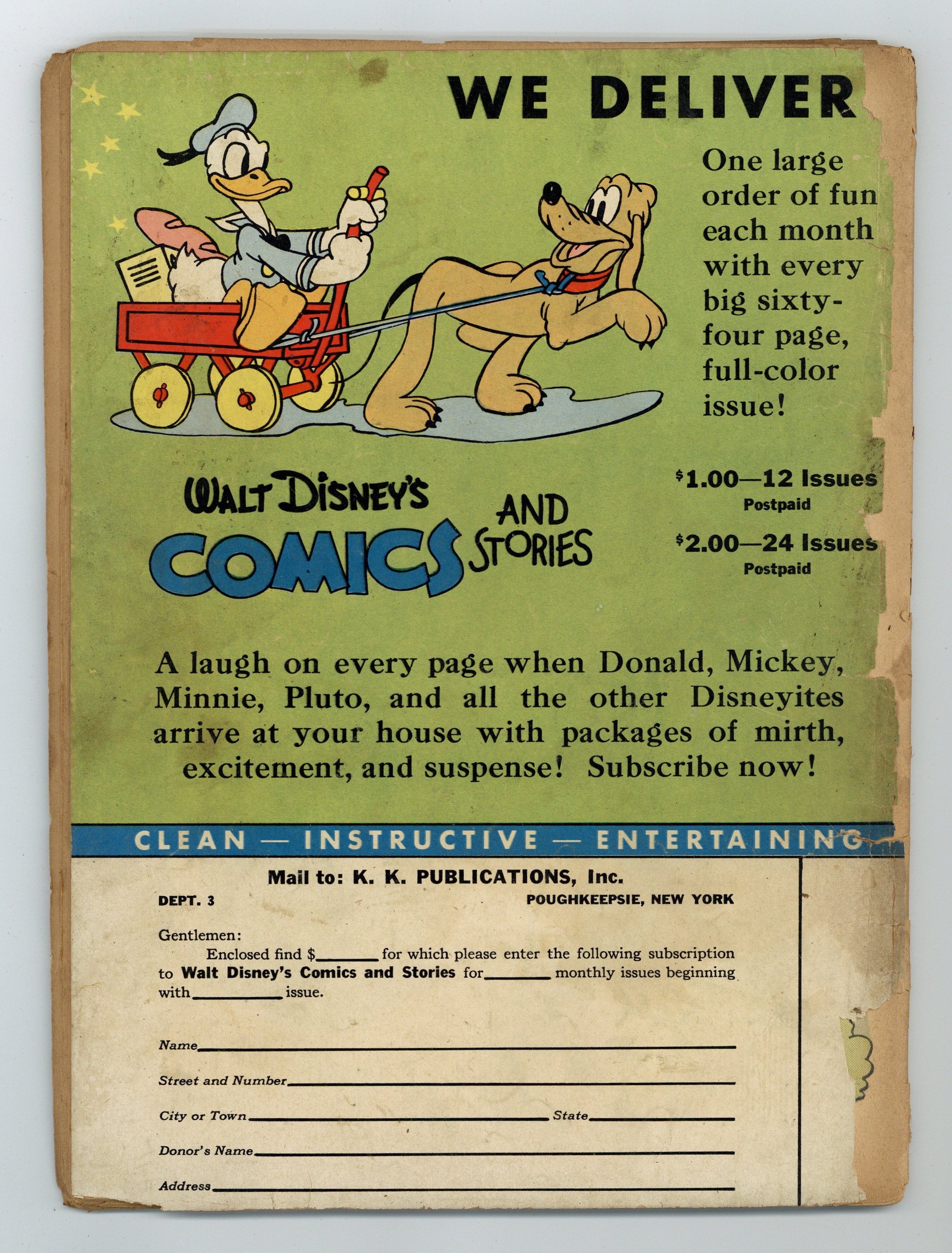 Stories and art by Floyd Gottfredson, Ted Thwaites, Merrill De Maris, Bob Karp, Bob Wright, Karl Karpé, Ken Hultgren and Al Taliaferro. Sometimes listed as Vol. 3 #6. The long-running vehicle for Disney character comics. In a classic Floyd Gottfredson story from the Mickey Mouse comic strip, Mickey gets a job as a bellhop at a haunted hotel. Huey, Dewey and Louie want to find out once and for all if the light turns off when you close the refrigerator. Donald buys a parrot that only speaks Chinese. Midnight Rendezvous; Roll Out the Barrel; He Knows All the Answers; Jam Session; Fooled You, Didn't We?; Calling Mr. Jones; Early Birds; The Key But No Success; Man's Best Friend; History Repeats Itself; Mickey Mouse, Bellhop Detective; Hollywood Chatter; The Umbrella Stayed Up; Hibernatin' Trouble; String Saver Mickey; The Mighty Knot; Timid Elmer's Picnic; A Star Is Born; Cut Rate; Check and Double Check; In the Red; Insurance Against Dogs!; Beggars Can't Be Choosers; An A-Track-Tive Offer; Home Defense; Trail's End; Tracking; Going Up; Just His Speed; Grade-A Service; Chicken in the Pot; The Old Army Game; L'Amour; Success; Nightmare; The Exciting Part; On the Warpath; Quenched But Drenched; Cold Facts; Smart at Figures. 64 pages, Full Color. Cover price $0.10. Grade: FR 1.0 explanation of grade Condition: Used (collectible)