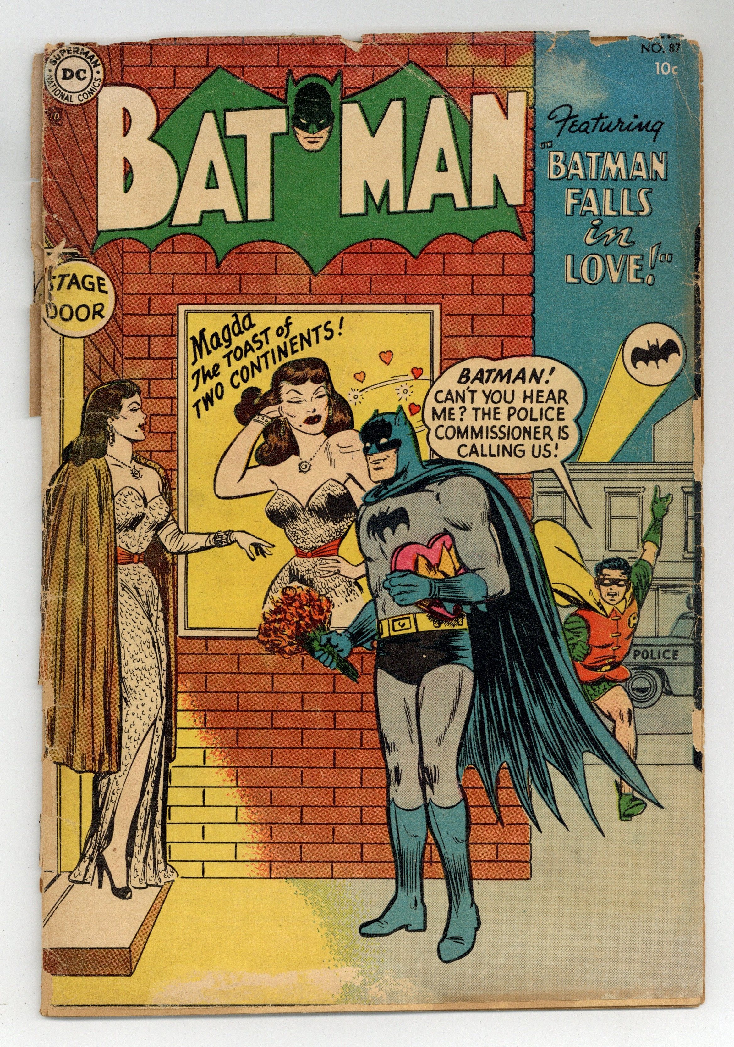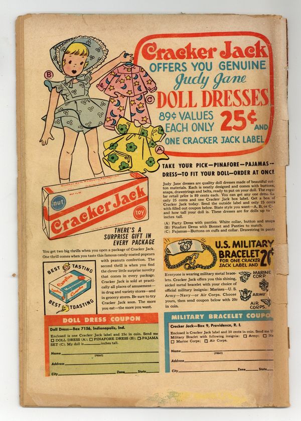 Cover by Win Mortimer. "Batman's Greatest Thrills!", script by Bill Woolfolk, pencils by Bob Kane, inks by Stan Kaye; Batman is surprised and honored that a TV station is presenting his life story and recounting some of his greatest feats....until the Joker decides to break out of prison and do his own "honoring" of the Caped Crusader! School Blues! public service announcement with Buzzy, script by Jack Schiff, art by Win Mortimer. One-page Casey the Cop story by Henry Boltinoff. "The Synthetic Crime King!", pencils by Sheldon Moldoff, inks by Stan Kaye; A miffed college professor decides to get revenge on his former employer by creating what is believed to be a synthetic man and using him as a weapon, But Batman discovers that this creature is actually a human being used by Vilmer, stops Vilmer and restores the athlete to his former self. Batman Whirly-word Game activity page by Martin Naydel. One-page Little Pete story by Henry Boltinoff. "They Prove the Guilty Innocent" text story by Jack Miller. "Batman Falls in Love!", script by Bill Finger, pencils by Bob Kane (Batman and Robin figures only) and Sheldon Moldoff, inks by Stan Kaye; Batman is to guard a foreign model, whose life has been threatened by a smuggling ring; But Vicki Vale nearly messes everything up with her jealousy. 44 Pages, Full Color. Cover price $0.10. Grade: PR 0.5 explanation of grade Condition: Used (collectible)
