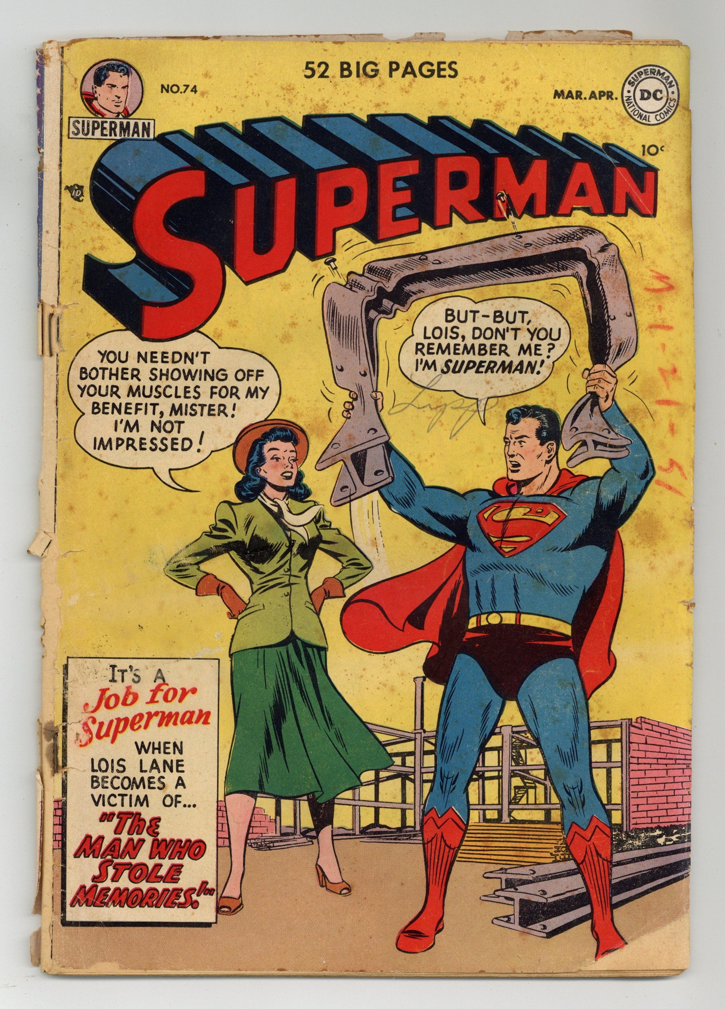 Misprinted Edition with #74 on cover. Cover art by Al Plastino. The Prankster's Star Pupil starring Superman and The Prankster, script by Edmond Hamilton, pencils by Wayne Boring, inks by Stan Kaye. Superman--Thrill Salesman, script by Edmond Hamilton, art by Al Plastino. So You Want To Be a G-Man? text story. The Man Who Stole Memories starring Superman, Moose Collins, and Professor Higgins, script by Bill Woolfolk; Lois Lane suffers temporary amnesia. Full-page ad for the feature film "Superman and the Mole Men." 52 Pages, Full Color. Cover price $0.10. Grade: FR 1.0 explanation of grade Condition: Used (collectible)