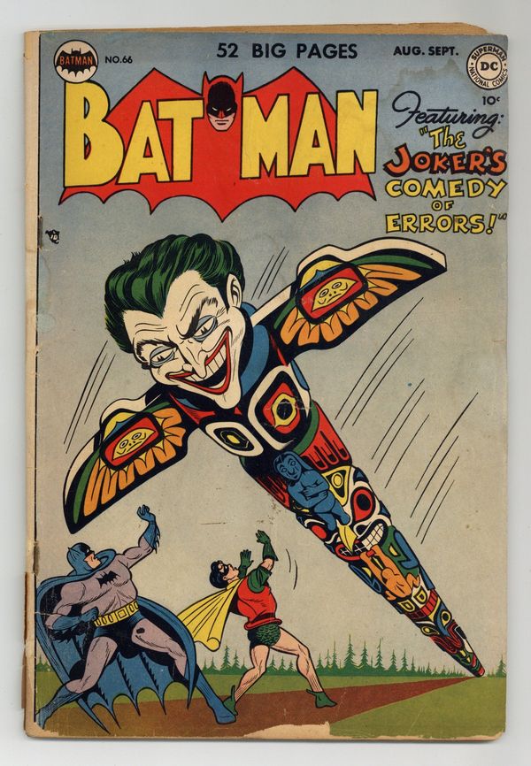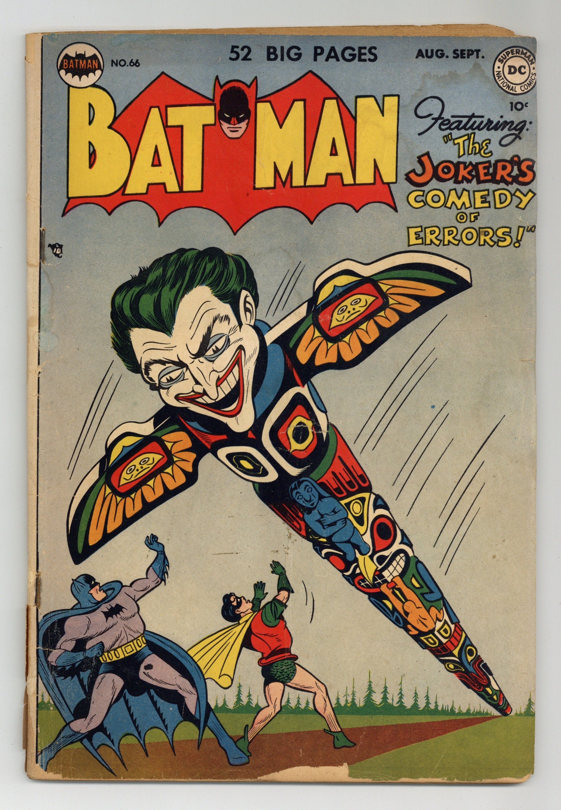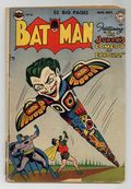 Cover pencils by Dick Sprang, inks by Charles Paris. "The Joker's Comedy of Errors!", script by Bill Finger, pencils by Bob Kane (Batman and Robin figures only) and Lew Sayre Schwartz, inks by Charles Paris; The Joker is obsessed with recreating some of historys most famous blunders; He tries to force Batman into making mistakes. -page Casey the Cop story by Henry Boltinoff. "The Movie Stars Who Died Twice!", script by Bill Finger, pencils by Dick Sprang, inks by Charles Paris; Batman and Robin investigate the case of film stars who start dying in the same way as their respective characters died in the movies. One-page Tootsie Roll ad, "Captain Tootsie and his Vacation-Time Pals" by Bill Schreiber. One-page Jerry the Jitterbug story by Henry Boltinoff. Script Sleuths article by Barbara Fairbanks, art by Raymond Perry. Half-page Casey the Cop story by Henry Boltinoff. "Batman II and Robin, Junior!", script by Bill Finger, pencils by Bob Kane (Batman and Robin figures only) and Lew Sayre Schwartz, inks by Charles Paris; Robin becomes disobeys Batman's orders; He is saved by the Dark Knight, and once they're back at the Batcave, Bruce scolds Robin for disobeying him. Sweet Land of Liberty public service announcement starring Peter Porkchops, script by Jack Schiff, art by Otto Feuer. One-page Tootsie Roll ad, "Captain Tootsie and his Vacation-Time Pals" by Bill Schreiber. 52 Pages, Full Color. Cover price $0.10. Grade: GD- 1.8 explanation of grade Condition: Used (collectible)