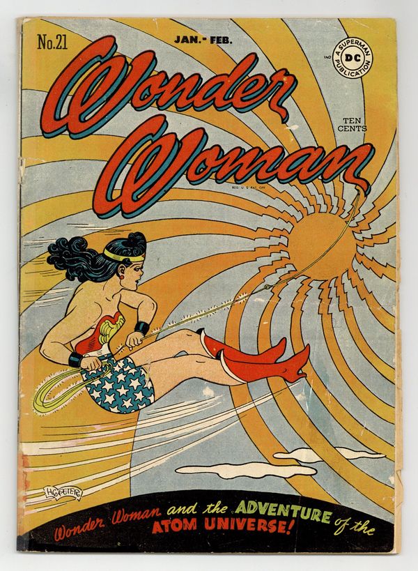 Cover by Harry G. Peter. "The Mystery of the Atom World" (Part 1), script by Joye Hummel (as Charles Moulton), art by Harry G. Peter; Following the test denotation of an atomic bomb, a small uranium microverse is created, which Wonder Wonder takes to Paula's lab. Wonder Women of History: three-page Annie Oakley bio, art by Robert Sale. "Tide of Atomic Fire" (Part 2), script by Joye Hummel (as Charles Moulton), art by Harry G. Peter; Atomia causes Wonder Woman and her friends to shrink to microscopic size and the Neutrons take them prisoner. Two-page text story, "The Kid's Last Plight" by Charles King. "Foney Fairy Tales" back-up story. "Foney Fairy Tales" back-up story, script and art by Ed Wheelan. "The Kid's Last Plight" text story by Ted Udall (as Charles King). "Ruler of the Atom World" (Part 3), script by Joye Hummel (as Charles Moulton), art by Harry G. Peter; When Atomia causes the atomic universe to attack a small island, Wonder Woman uses the enlarging ray to bring Atomia back to full size. 52 Pages, Full Color. Cover price $0.10. Grade: Coverless explanation of grade Condition: Used (collectible)
