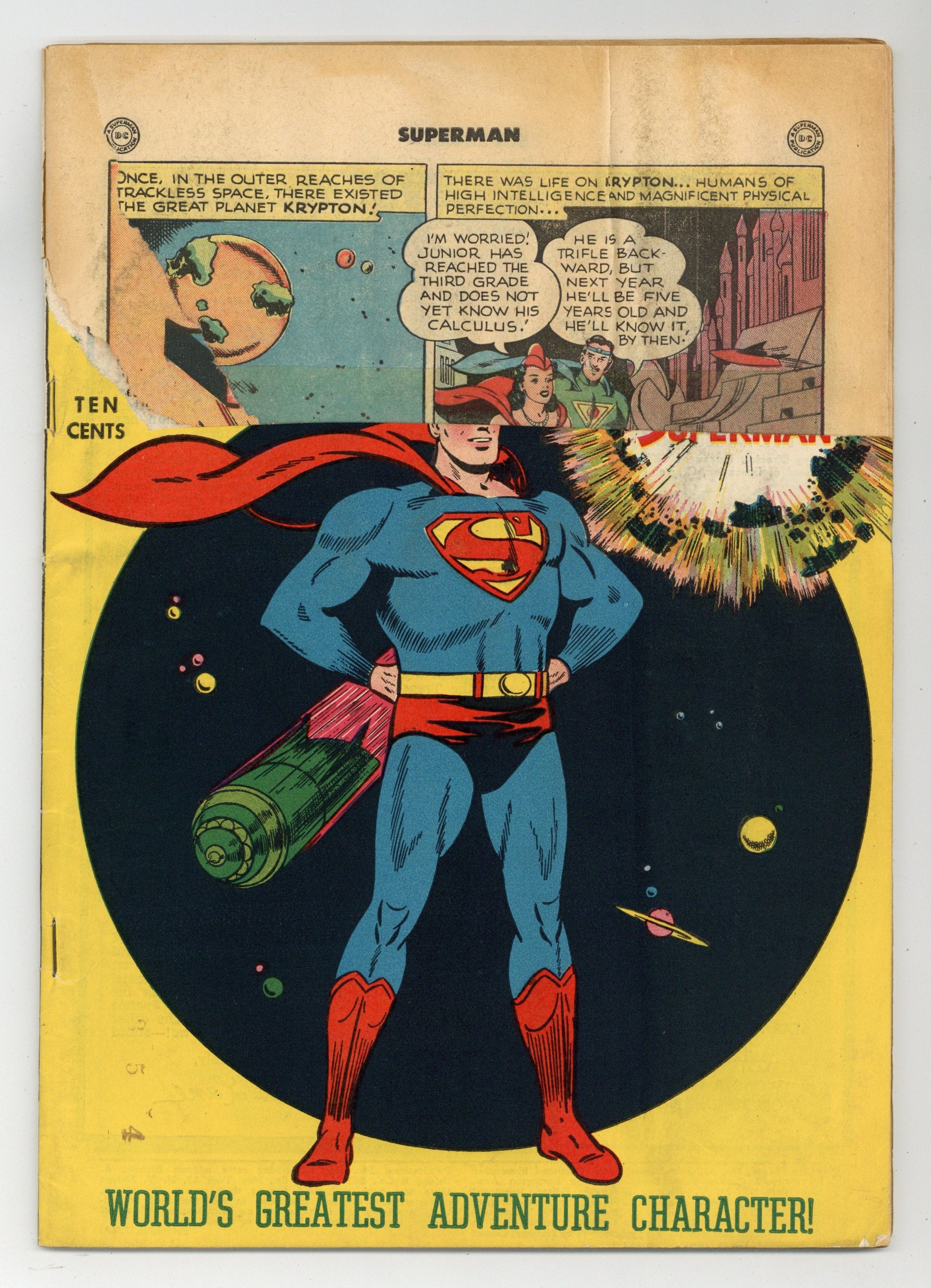 Cover pencils by Wayne Boring, inks by Stan Kaye. List of Superman's accomplishments in the "real world." The Origin of Superman, script by Bill Finger, pencils by Wayne Boring, inks by Stan Kaye; After a prologue that demonstrates Superman's amazing abilities, his origin is recounted. Tootsie Rolls ad, art by C. C. Beck. The Oracle From, script by Alvin Schwartz, art by Al Plastino; Professor Grog accidentally sends Superman and mechanic Mike Mooney back to ancient Egypt. Shorty humor two-pager by Henry Boltinoff. The Tiniest Things In the World text article by Joe Samachson [as William Morrison]. A Job For Superhombre, script by Don Cameron, art by Al Plastino. 52 Pages, Full Color. Cover price $0.10. Grade: PR 0.5 explanation of grade Condition: Used (collectible)